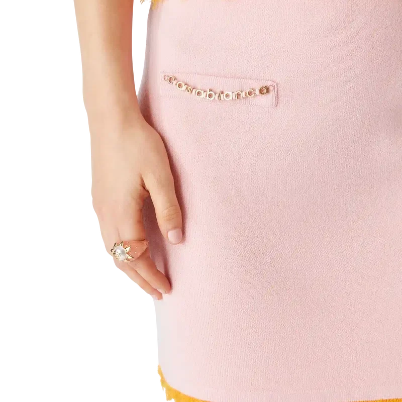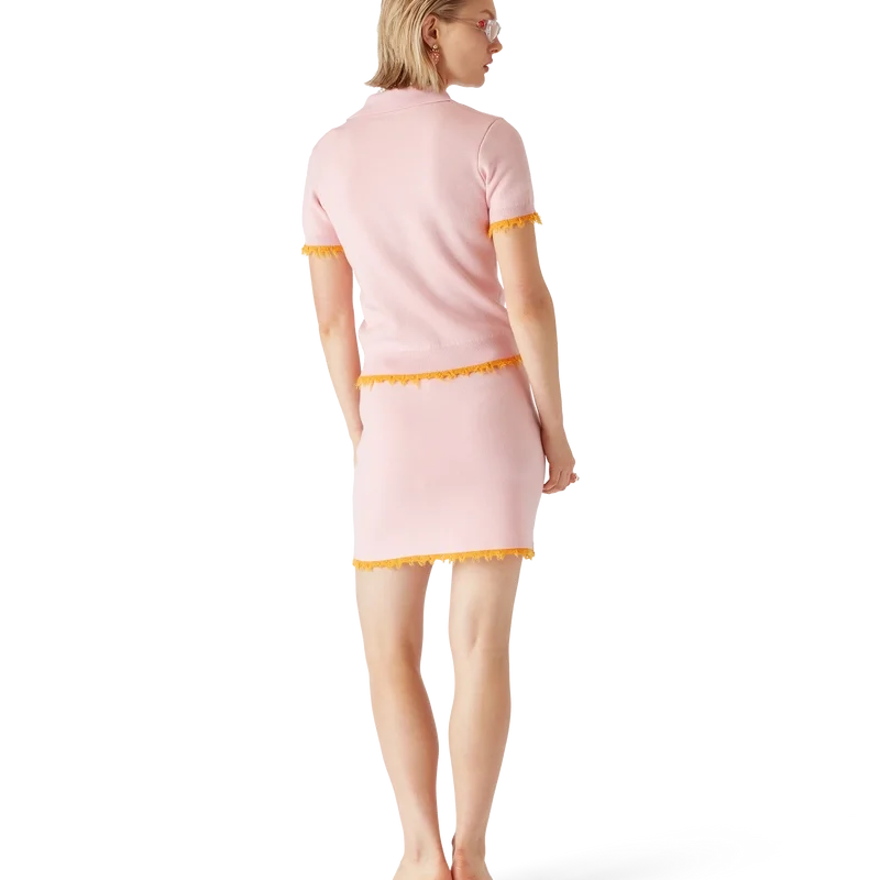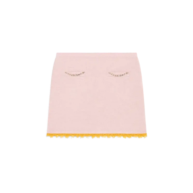 Der Merino-Minirock ist ein figurbetontes Modell aus Merinowolle mit A-Linien-Silhouette. Abgerundet durch Paspeltaschen und ausgefranste Kanten.