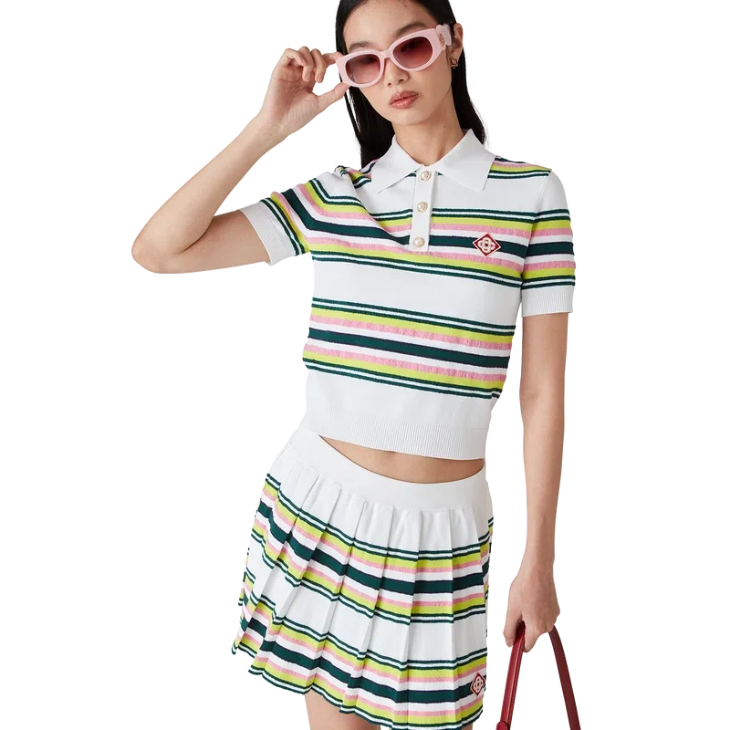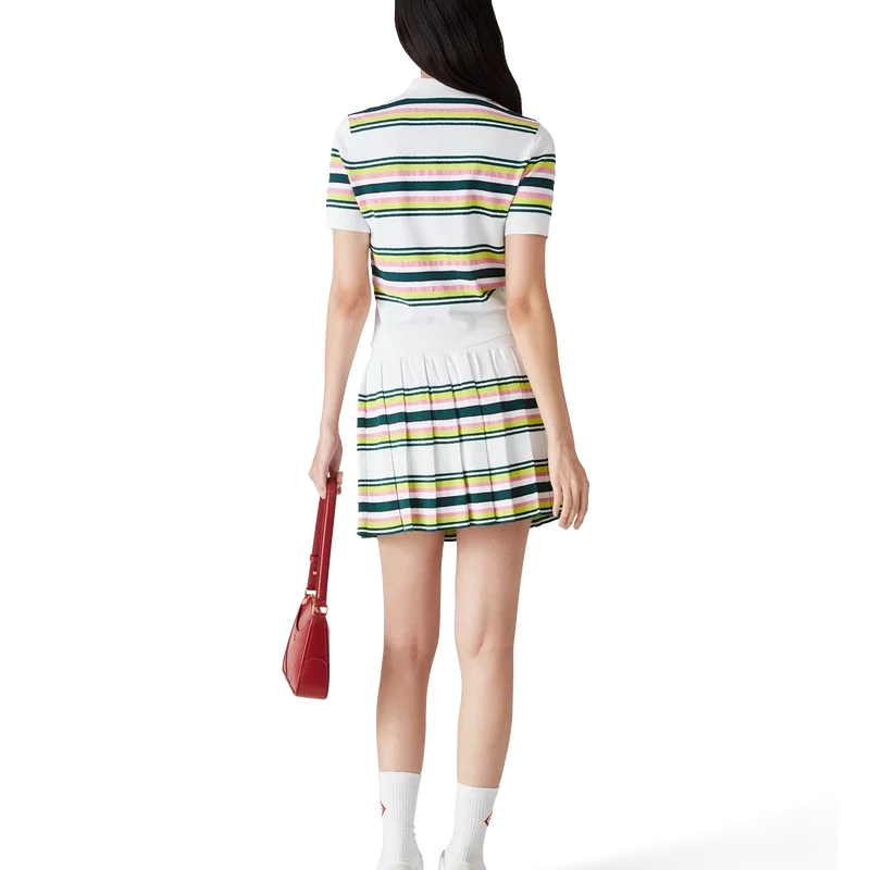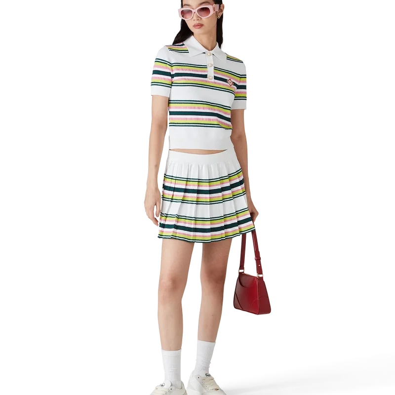 Der gestreifte Faltenrock ist ein Minirock aus gestreiftem Stoff. Mit elastischem Bund, Falten, grünen, rosa und blauen Querstreifen, seitlichem Reißverschluss und integrierten Shorts.