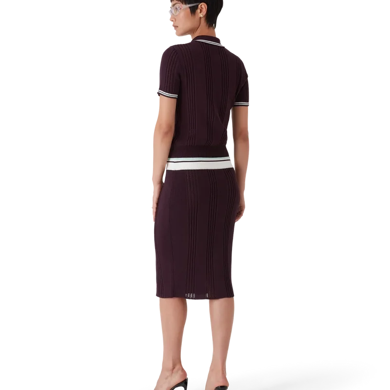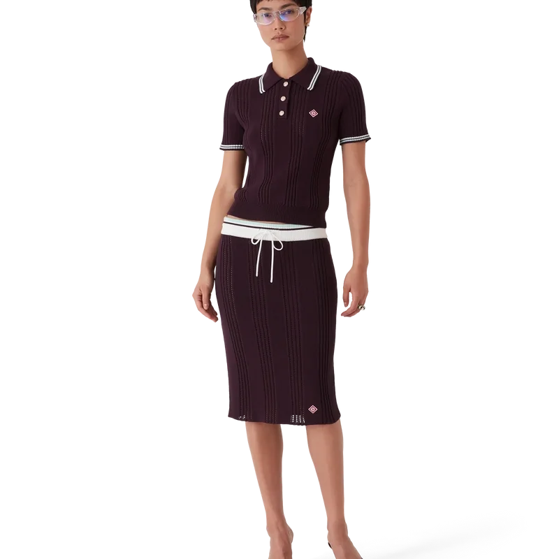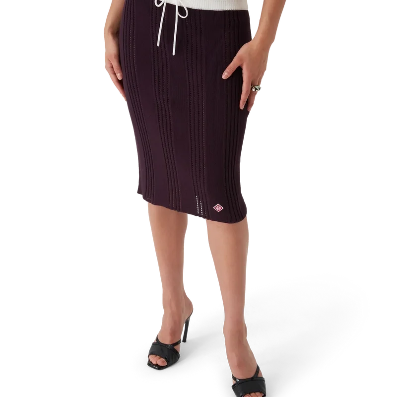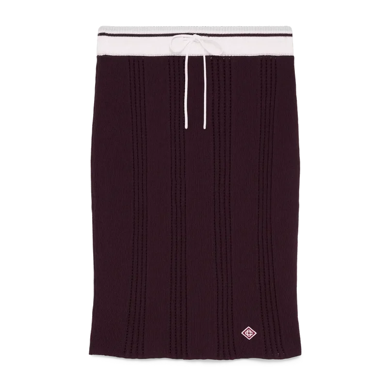 Der Midi-Rock aus Baumwollstrick ist ein klassisches, mittellanges Modell mit dem charakteristischen Rautenlogo des Hauses, gefertigt aus Baumwollstoff. Abgerundet wird er durch einen Kontraststreifen, einen gerippten, elastischen Bund und einen Kordelzug.