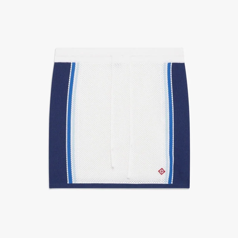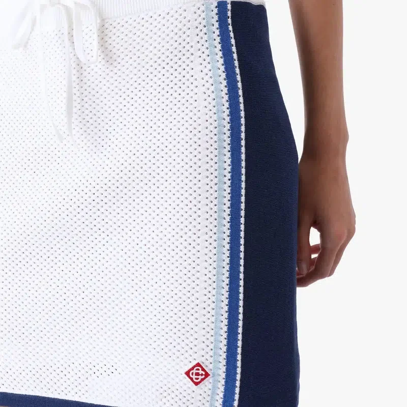 Der weiß-blau gestreifte Mesh-Minirock ist ein raffiniertes Strickdesign mit dem charakteristischen Rautenlogo des Hauses. Abgerundet durch einen elastischen Bund, einen Kordelzug und blaue Streifendetails an den Seiten. Entworfen, um mit dem passenden Mesh-Oberteil getragen zu werden.