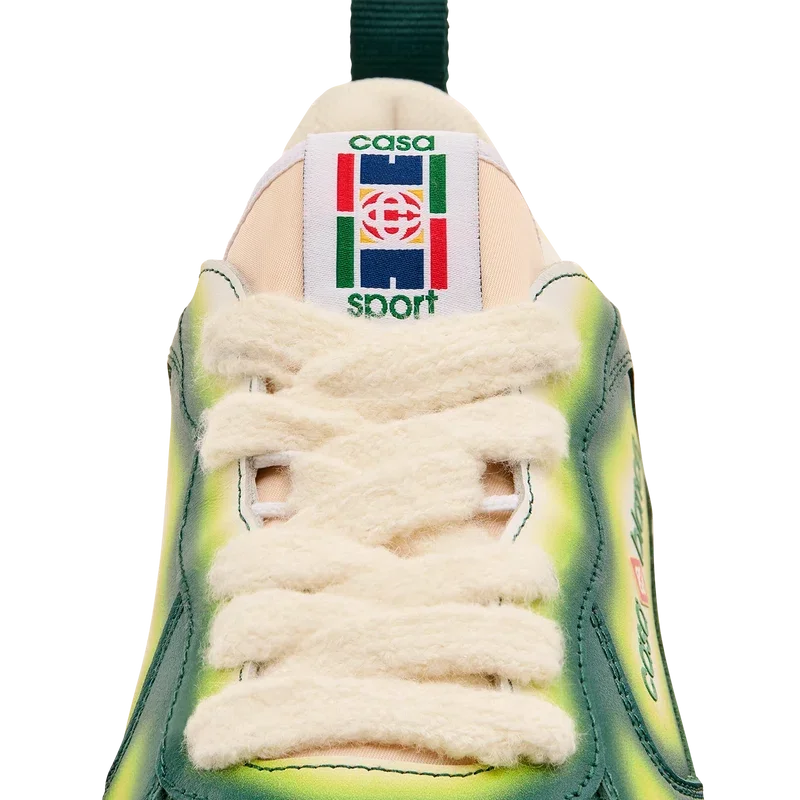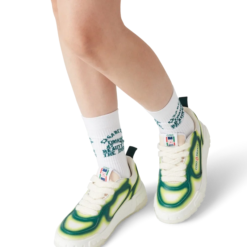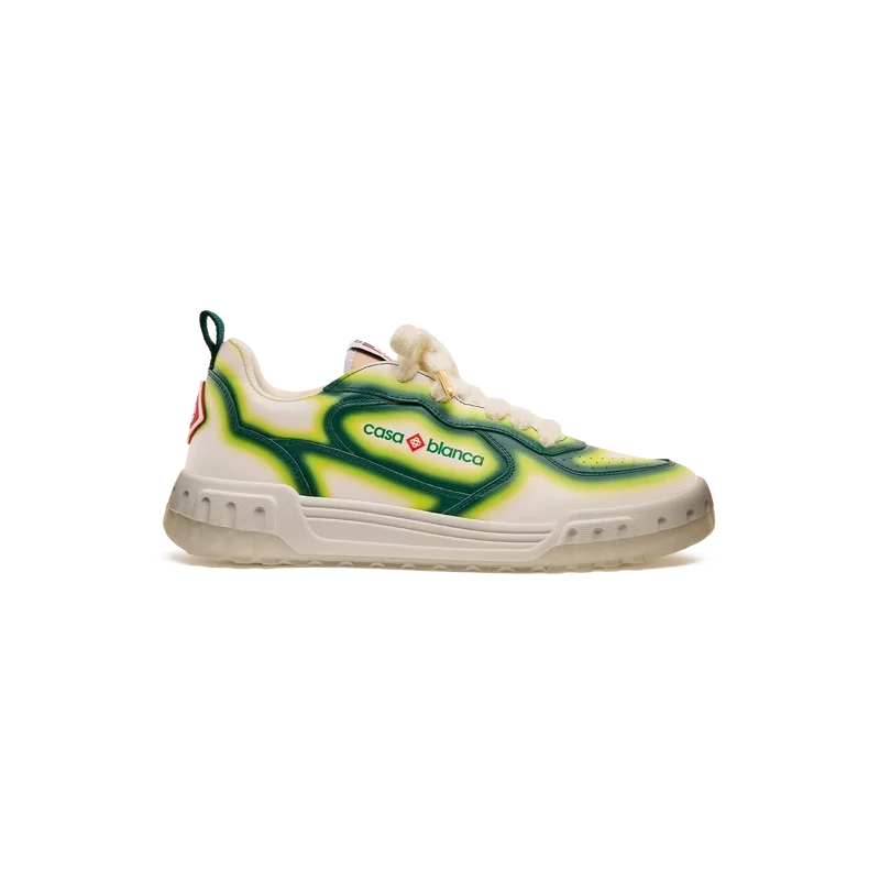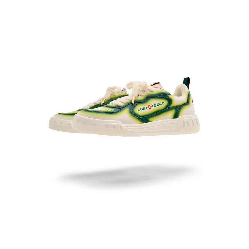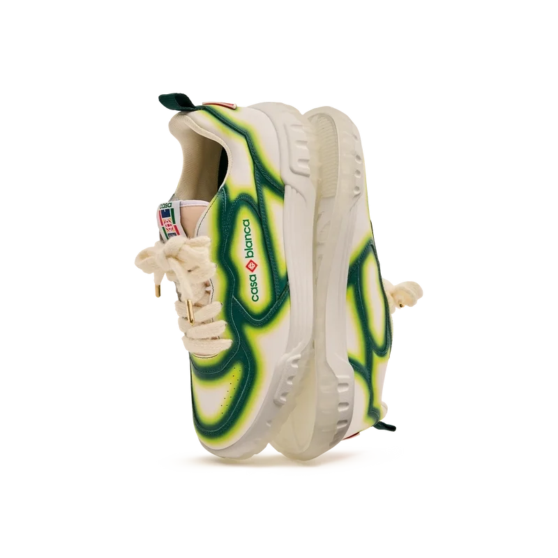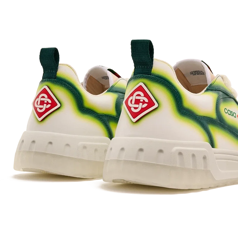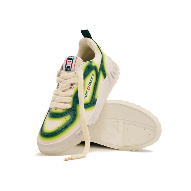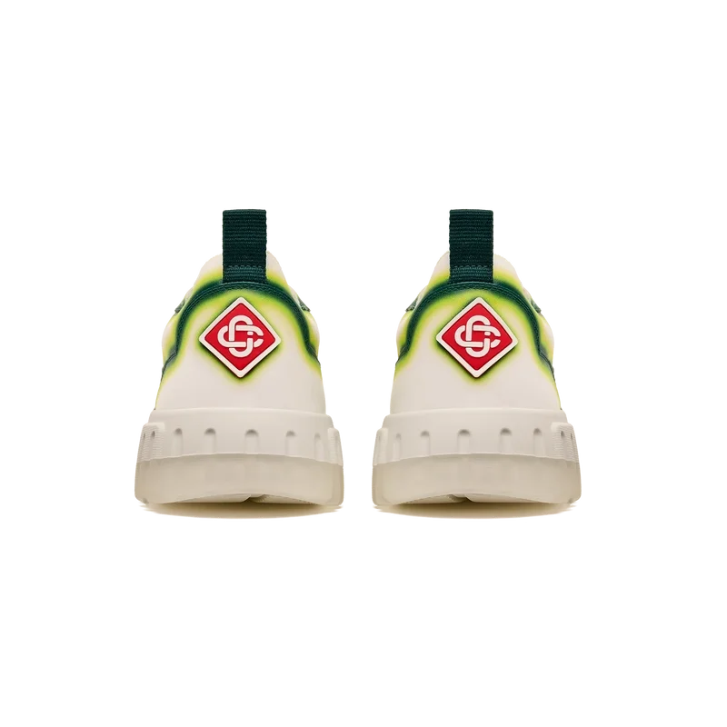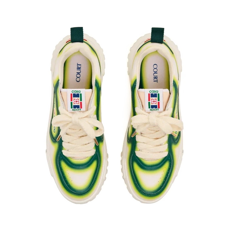Die Designsprache des Court Sneakers spiegelt die ikonischen Silhouetten der 90er Jahre wider. Die Farben der Gummisohle sind eine Kombination aus den raffinierten Codes des Tennissports und der klassischen Architektur und schaffen eine einheitliche Farbpalette für den gesamten Schuh, wobei der Fokus auf Primärfarben liegt, die durch Tennisweiß abgesetzt werden, um eine sportlich orientierte Farbgeschichte zu schaffen. Das Obermaterial der Schuhe weist integrierte, fließende Panel-Linien auf, die an die ikonischen Silhouetten der 90er Jahre anknüpfen. Das markante Casablanca-Branding ist durchgehend sichtbar, einschließlich des charakteristischen Diamantmotivs der Marke an der Ferse, der seitlichen Silikon-Wordmark-Einsätze sowie des gewebten Zungenlabels und der Einlegesohle mit Tennisplatz-Motiv, die dem Schuh seinen Namen „Court“ geben.