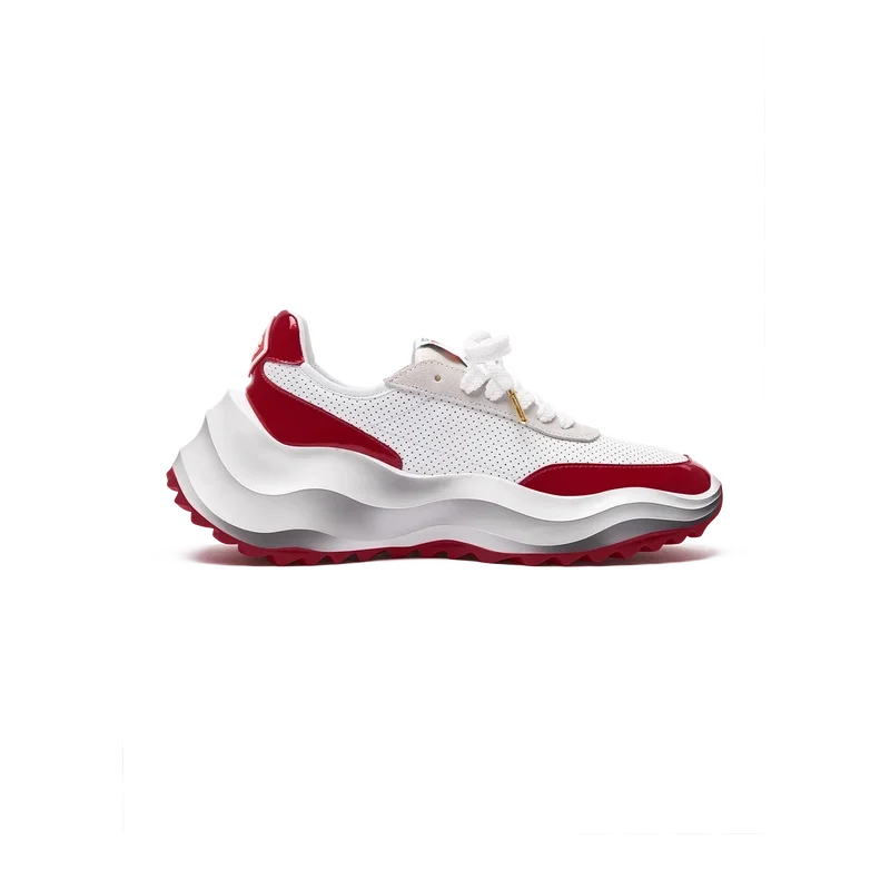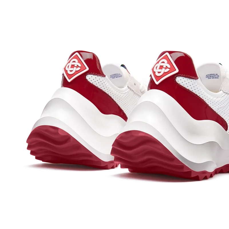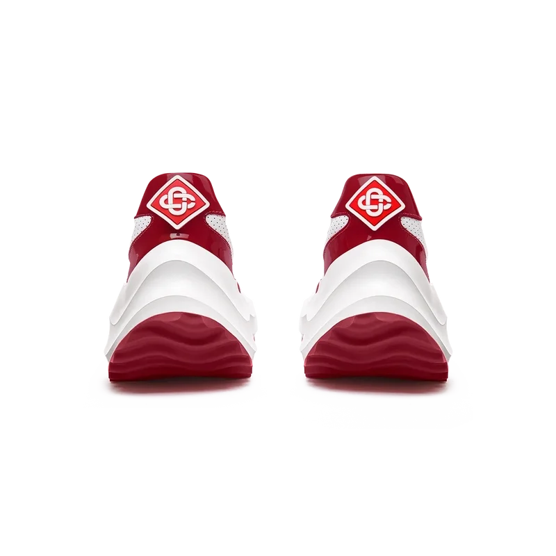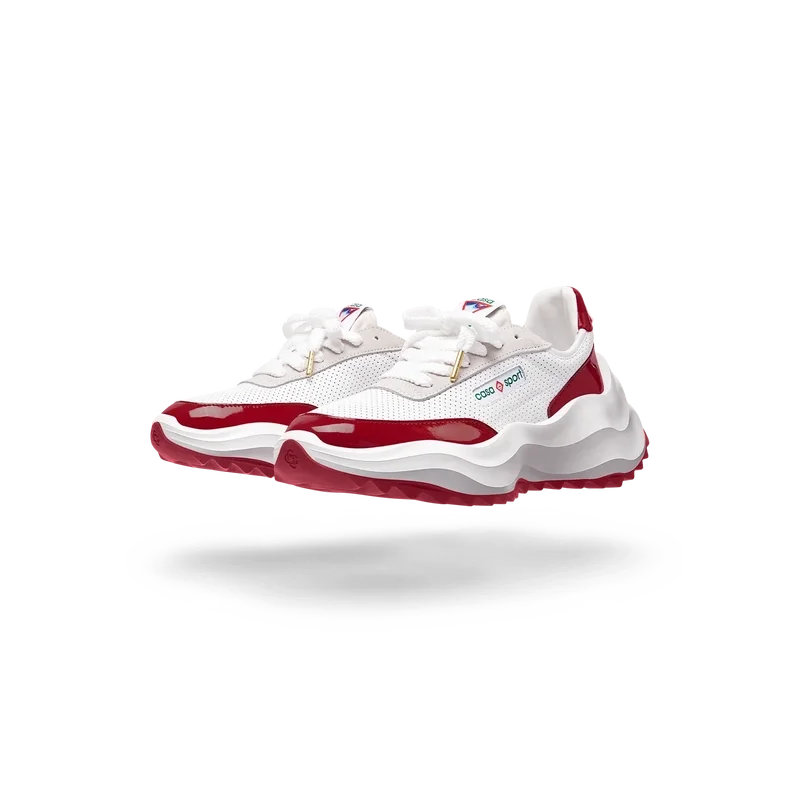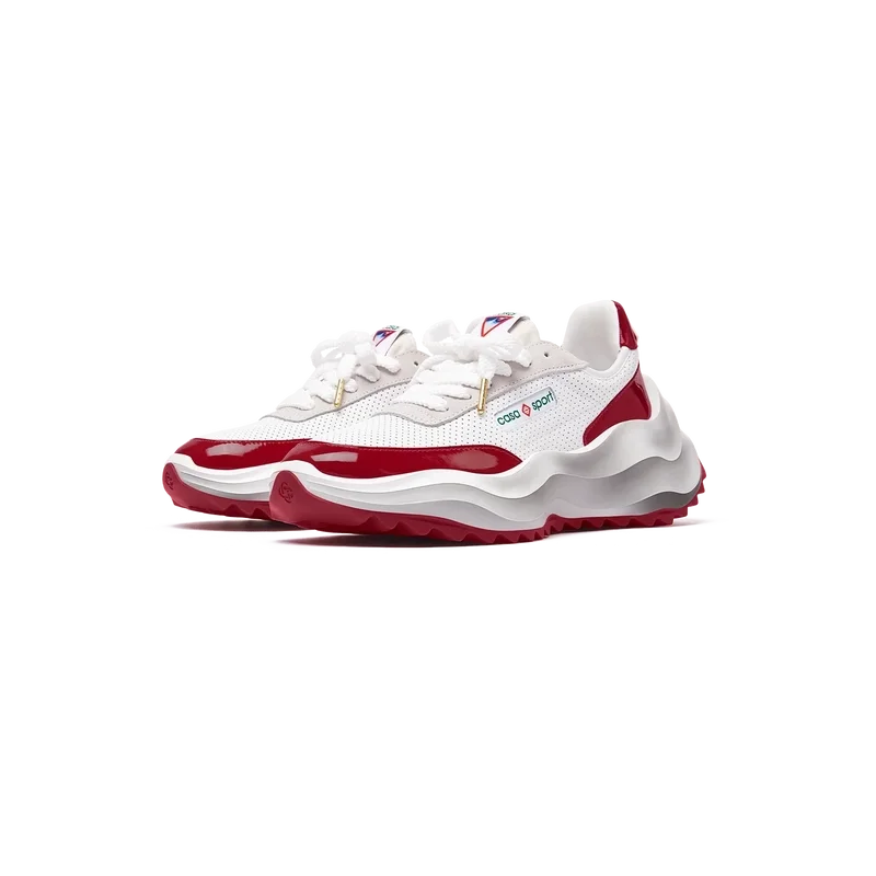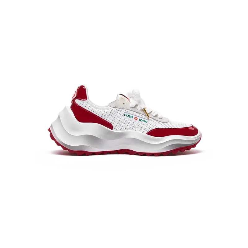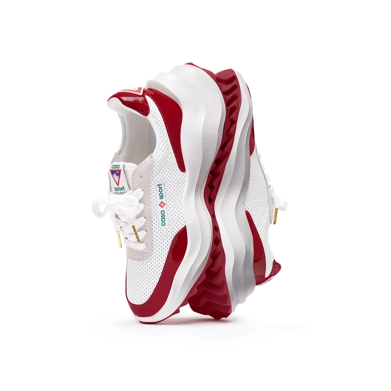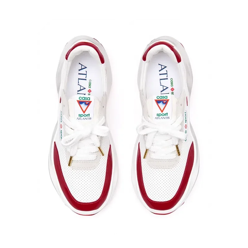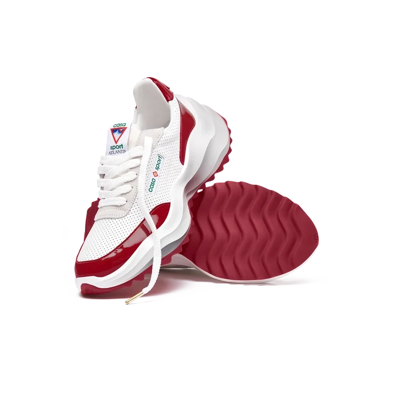 Farblich abgestimmte Overlays aus Haute Red-Lackleder, Obermaterial aus perforiertem Leder, kontrastierende Schnürsenkelhalterung aus Wildleder, Casablanca-Diamant-Gummipatch mit Markenlogo an der Fersenlasche, gewebtes Casa Sport-Fensteretikett mit Markenlogo an der Seitenwand, gewebtes Atlantis-Zungenetikett, geformte EVA-Wave-Zwischensohle, Gummi-Außensohle, goldene Schnürsenkelenden