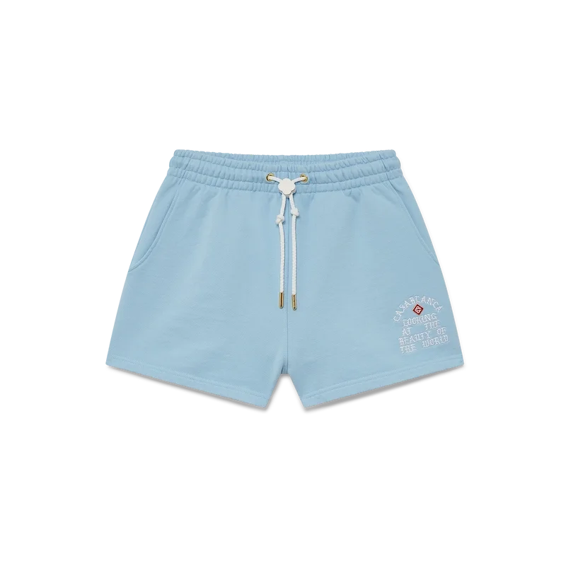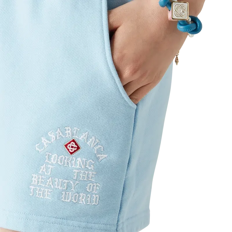 Die Beauty of the World Sweatshorts sind ein Sportbekleidungsdesign aus Bio-Baumwollstoff und tragen das Motto der Marke Casablanca in gotischer Typografie, inspiriert von der Street-Kultur. Abgerundet durch einen elastischen Bund, einen Kordelzug mit goldenen Enden, schräge Seitentaschen und eine aufgesetzte Gesäßtasche.