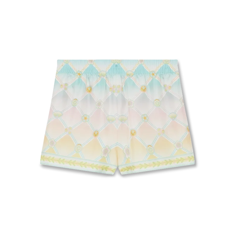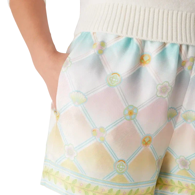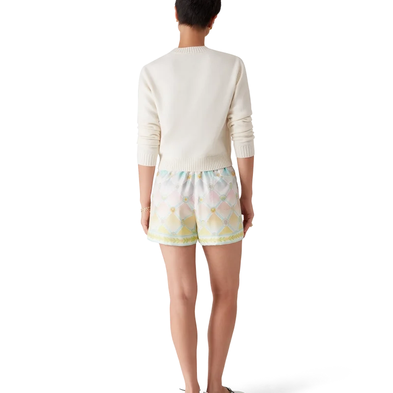 Die Candy Icons Seiden-Twill-Shorts sind ein durchgehend bedrucktes Design aus Seidenstoff mit dem Candy Icons-Muster, das in Pastelltönen und im Stil unserer Kawaii-Icons gestaltet wurde. Es handelt sich um ein sich wiederholendes Design, das zudem einen Farbverlaufseffekt aufweist. Dieses Muster findet sich sowohl in der Herren- als auch in der Damenkollektion wieder. Abgerundet durch einen elastischen Bund, einen Kordelzug, Eingrifftaschen, eine aufgesetzte Gesäßtasche und Saumdetails mit dem Lorbeerblatt-Motiv des Hauses.