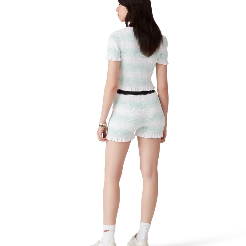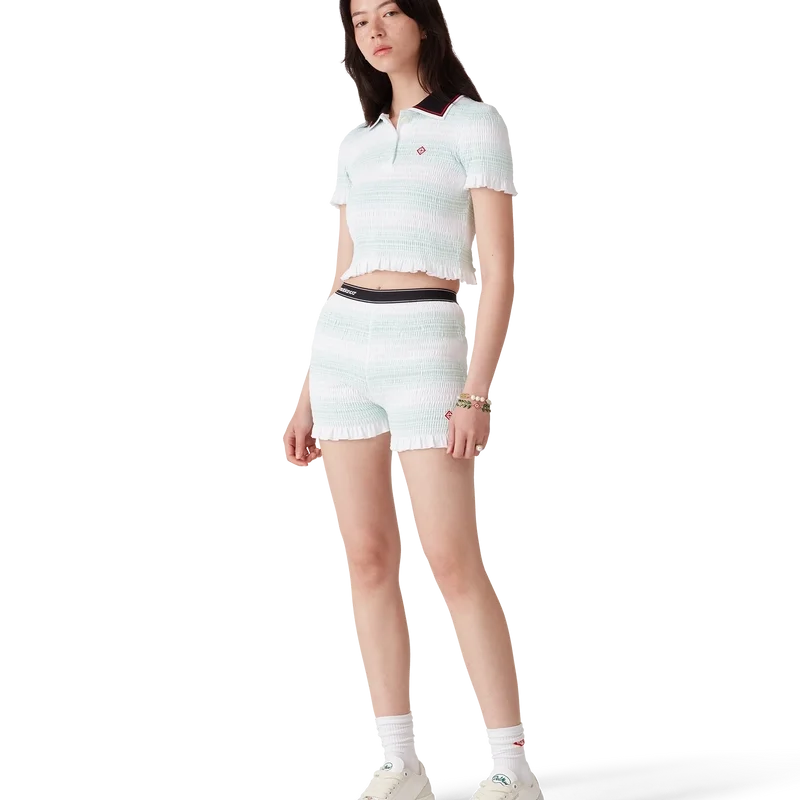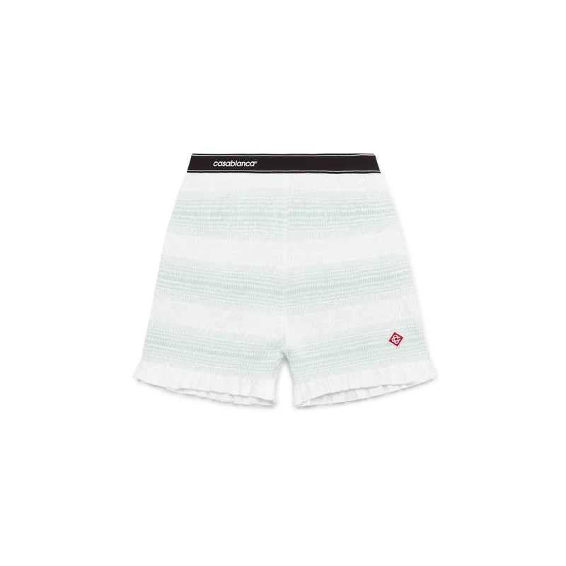 Die gestreiften, gerafften Shorts sind ein kurzes Modell aus gerafftem Baumwollstoff mit dem charakteristischen Rautenlogo des Hauses. Abgerundet durch einen elastischen Bund mit Casablanca-Logo und Kantenverzierung sowie Rüschen am Saum.
