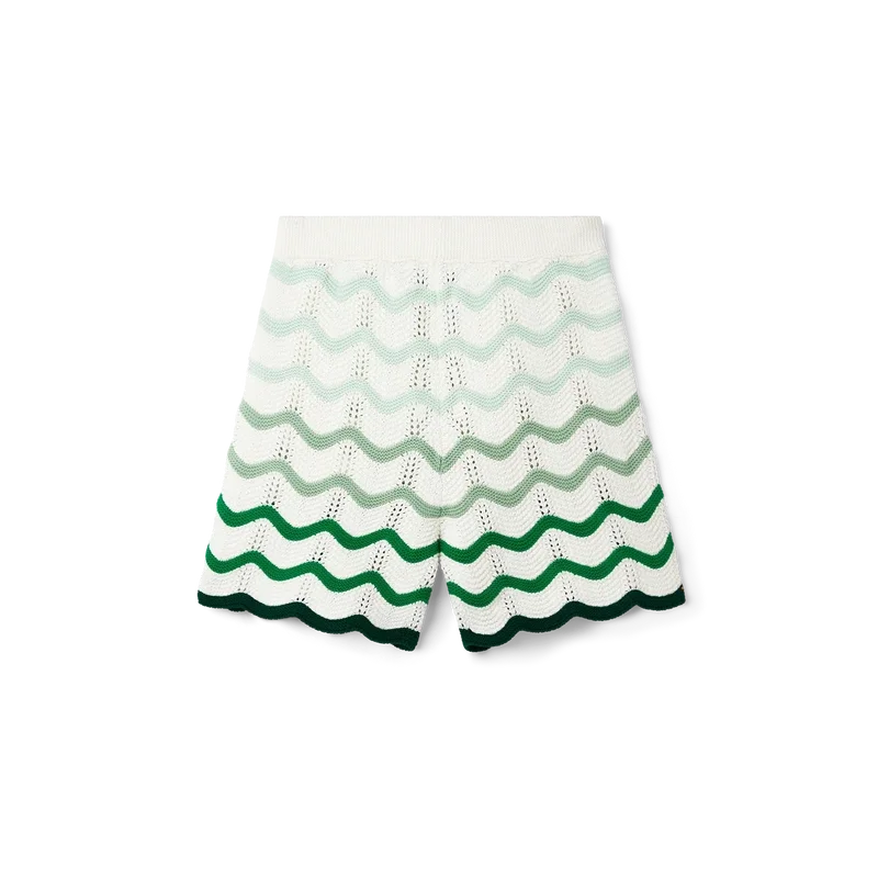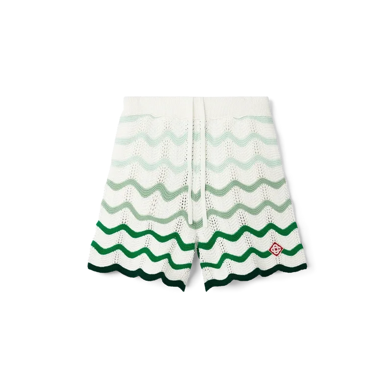 Die „Wavy Gradient Crochet Short“ ist ein typisches Casablanca-Modell aus einem weichen, strukturierten Häkelstoff mit offenem Gewebe. Sie ist mit einem innenliegenden Kordelzug, dem Diamant-Logo des Hauses und einem Casablanca-Markenlabel versehen.<!–