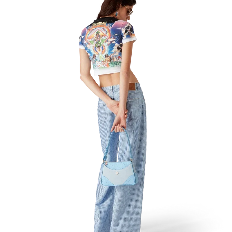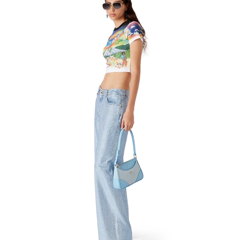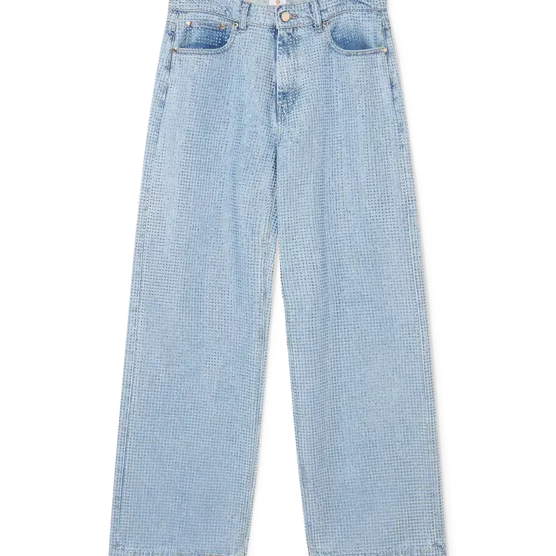 Die Jeans mit Kristallverzierung ist ein Modell mit geradem Bein aus Baumwollstoff und verfügt über Hotfix-Kristalle in einem durchgehenden Muster. Abgerundet wird sie durch vergoldete Metallteile, Gürtelschlaufen, Vorder- und Gesäßtaschen, ein Lederpatch mit Markenlogo und einen Reißverschluss.