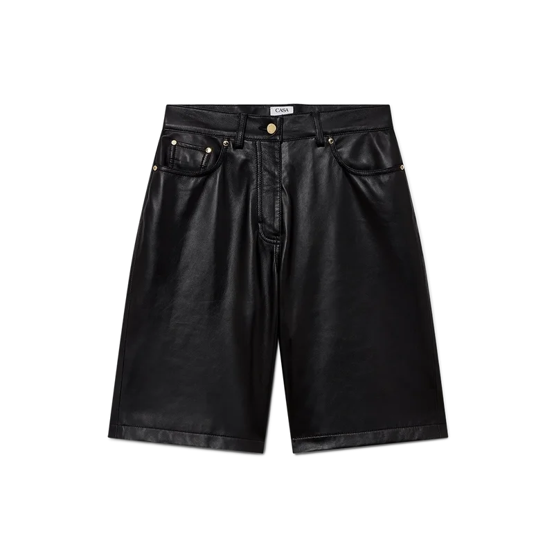Die Leder-Skater-Shorts sind ein knielanges Modell mit lockerer Passform aus Lamm-Nappa. Mit A-Linien-Saum, Bund, Gürtelschlaufen, vergoldeten Metallbeschlägen, Vordertaschen, Gesäßtaschen und Reißverschluss.
