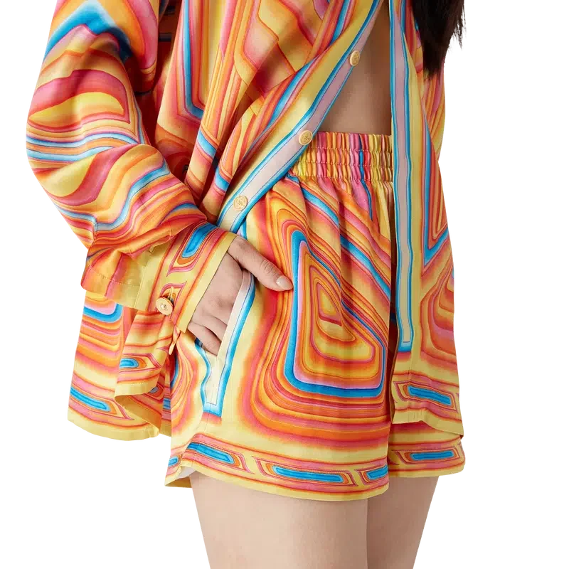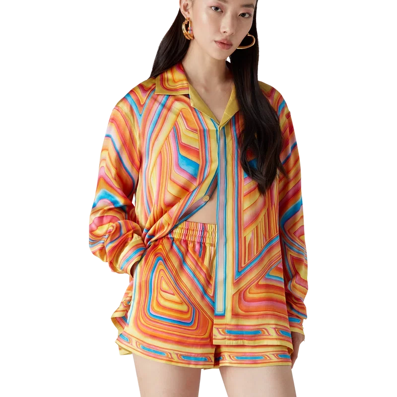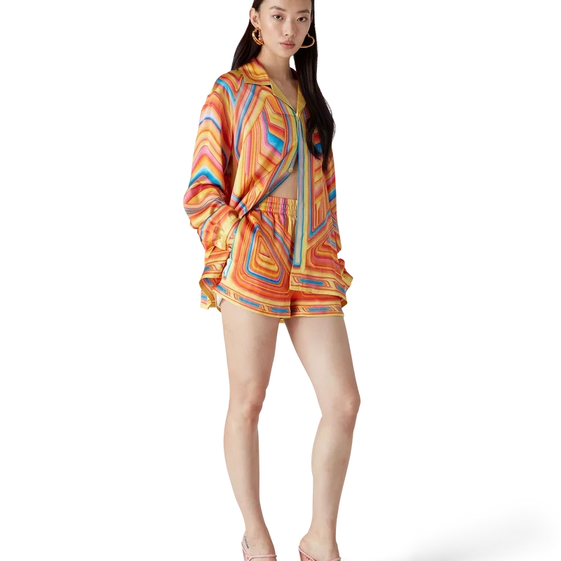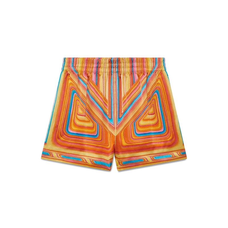 Die Low Rider Seidenshorts sind ein durchgehend bedrucktes Design aus Seidensatin, das das saisonale Artwork des Hauses zeigt, das sich auf die knalligen Farben und Airbrush-Maltechniken von Low Rider-Autos bezieht, ergänzt durch das Casablanca-Logo. Ausgestattet mit einem elastischen Bund, Seitentaschen in den Beinen, einer aufgesetzten Gesäßtasche, Kordelzugverschluss und einem Futter.