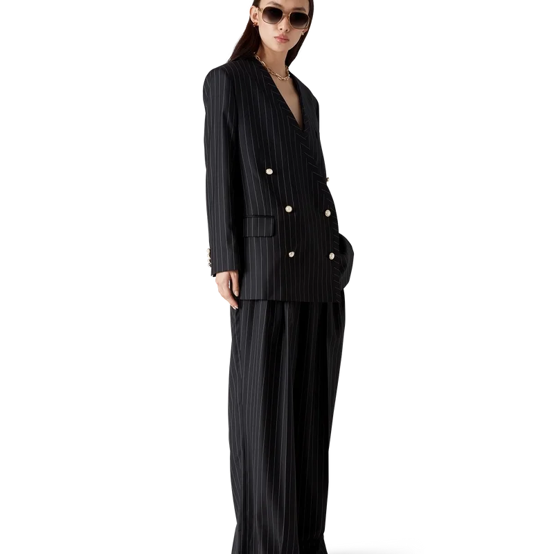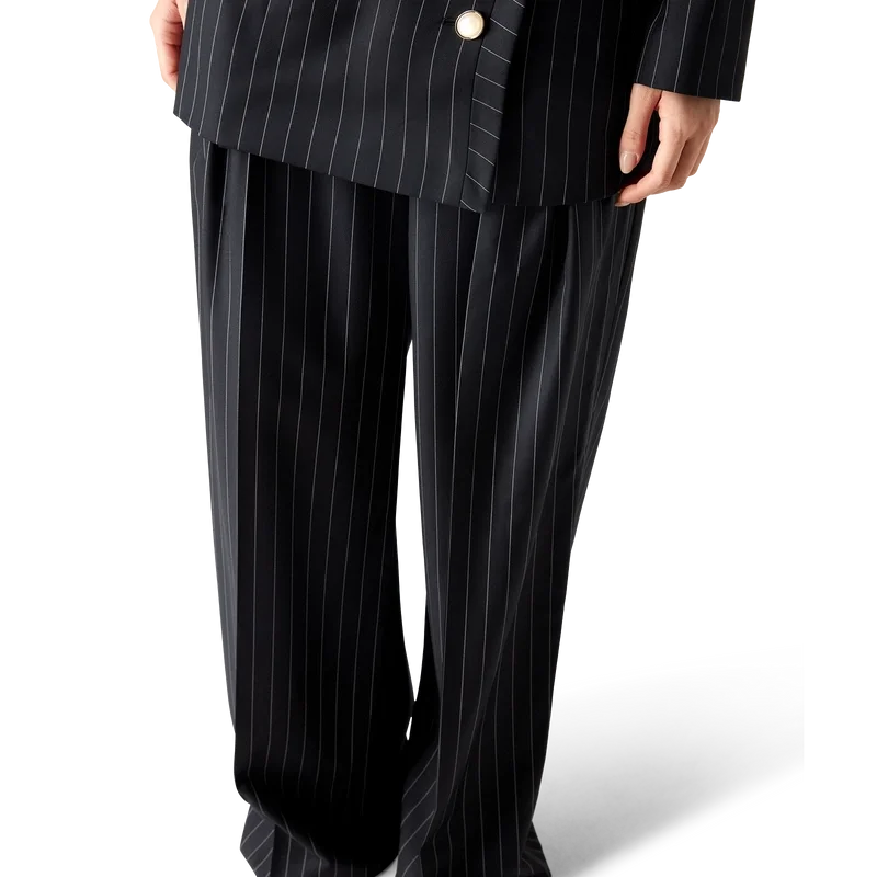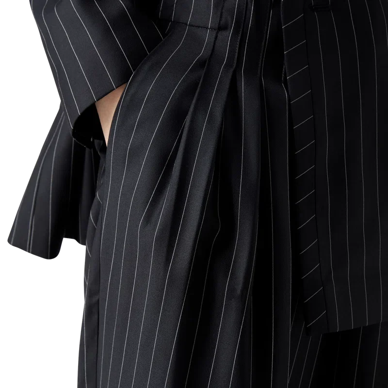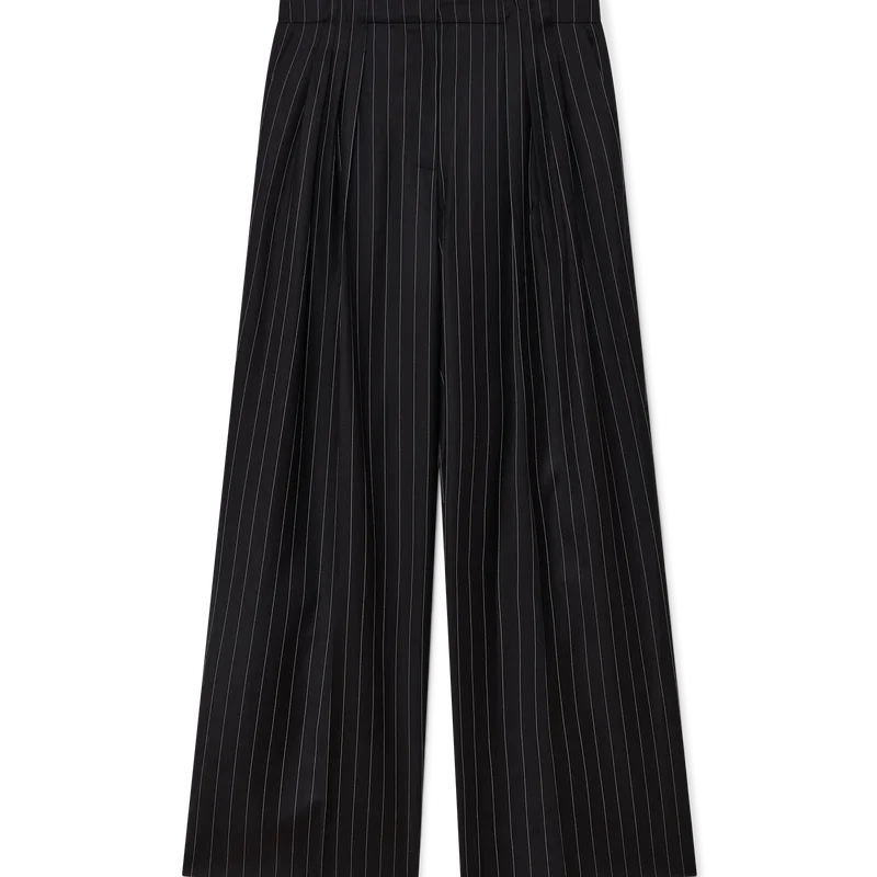 Die maßgeschneiderte Hose aus Wolle mit Nadelstreifen und dreifachen Falten hat ein gerades Bein und ist aus Wollstoff gefertigt. Sie verfügt über einen Bund, Gürtelschlaufen, drei Falten, schräge Vordertaschen und Paspeltaschen hinten mit flachem Knopfverschluss.