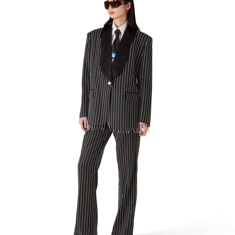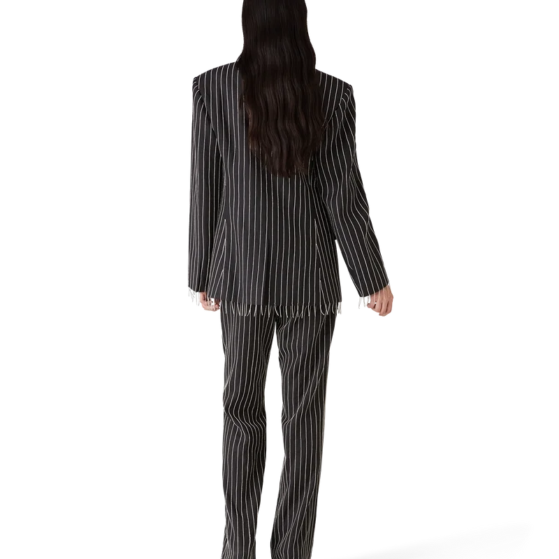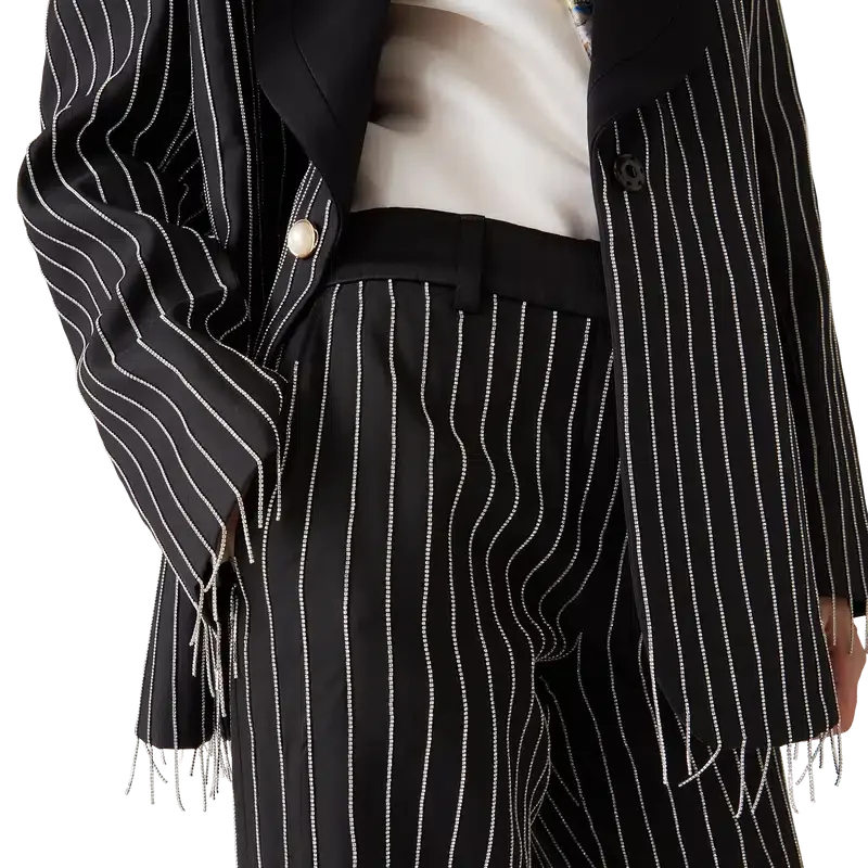 Die mit Kristallen verzierte, maßgeschneiderte Hose hat ein schmales Design, ist aus Seiden-Anzugstoff und Kristallen gefertigt und verfügt über ein Futter aus Baumwollmischung. Abgerundet wird sie durch einen Reißverschluss, Seitentaschen und Gesäßtaschen mit Paspel.
