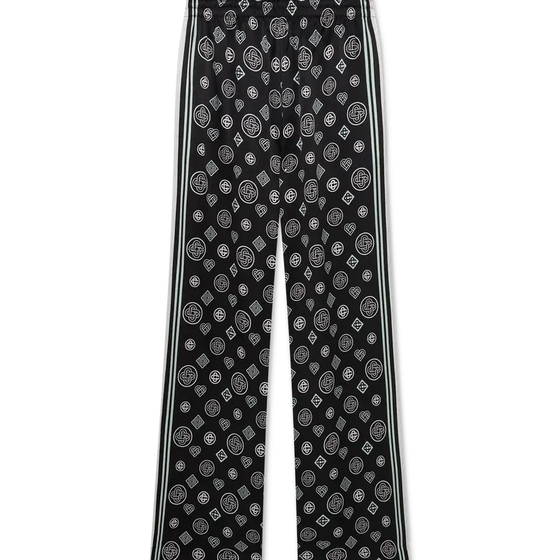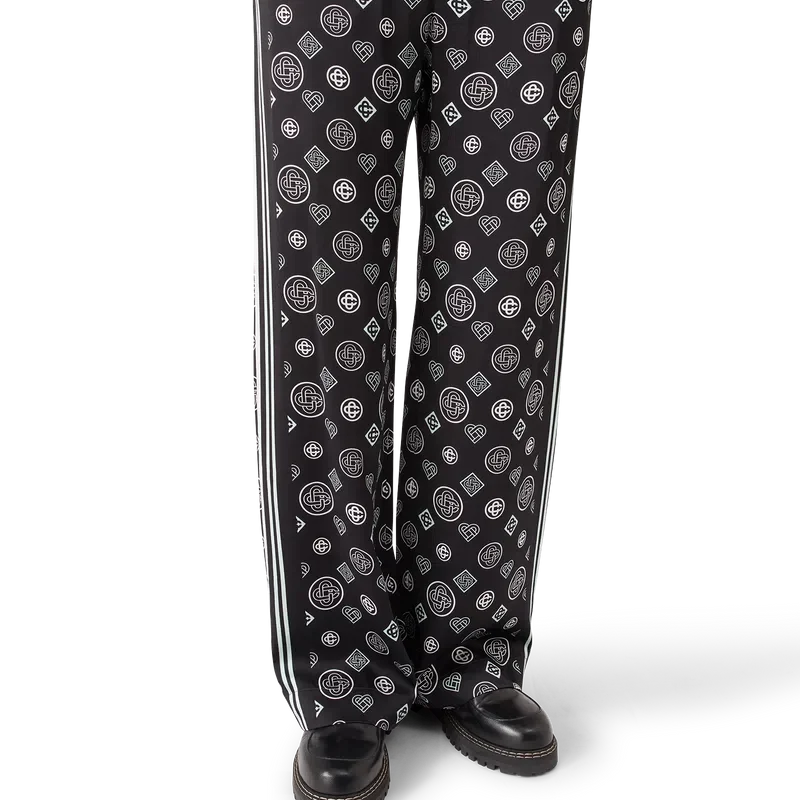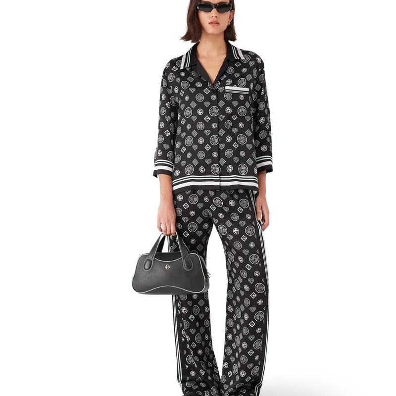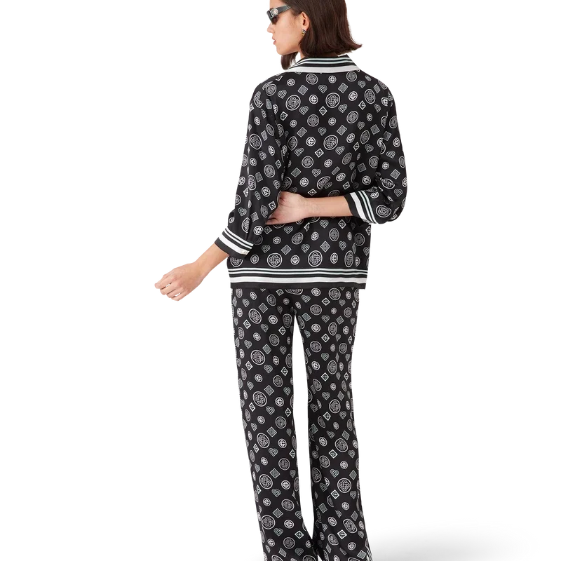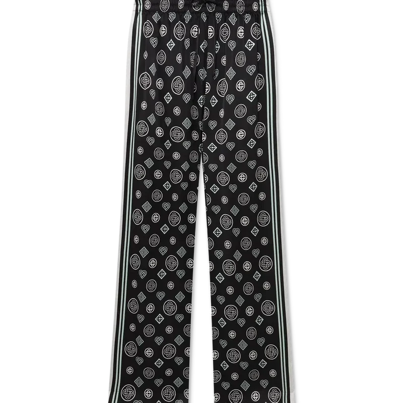 Die Monogram-Seidensatin-Pyjama-Hose ist ein durchgehend bedrucktes Design mit dem Honeydew-Logo-Print der Saison. Dieses Muster unterscheidet sich von unseren anderen Monogrammen, da es einzigartige Formen zu einem einheitlichen Muster kombiniert. Es handelt sich eher um ein ikonisches Design. Abgerundet durch einen elastischen Bund, einen Kordelzug, Seitentaschen in den Beinen und schwarz-weiße Streifendetails an den Seiten.