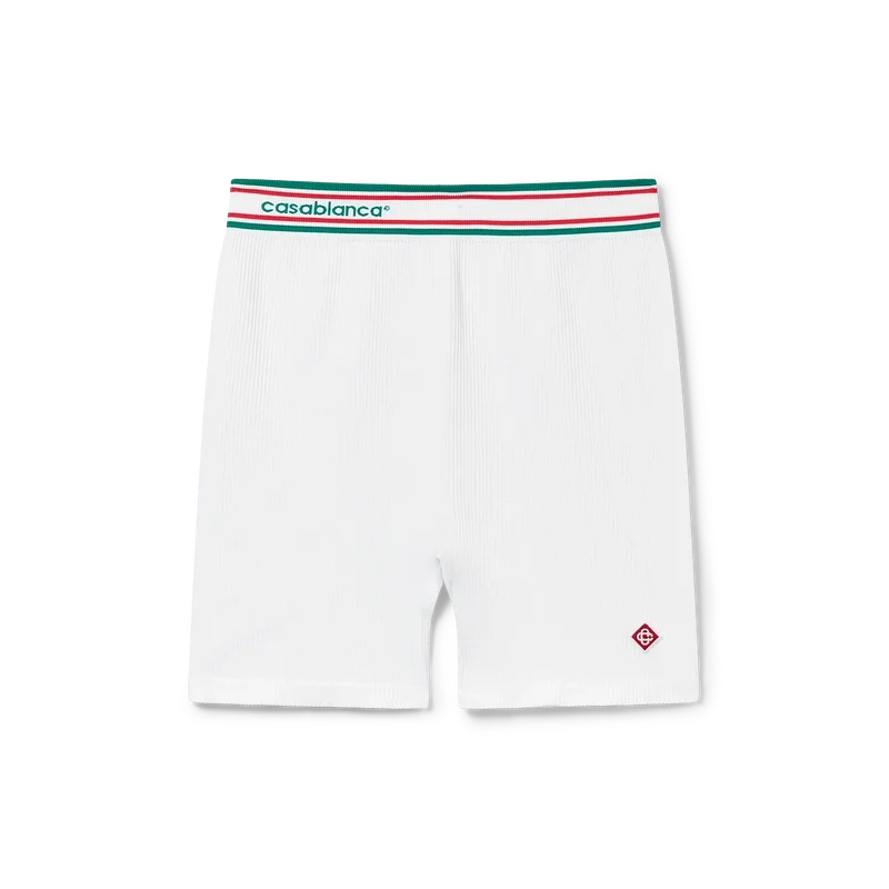 Die nahtlosen Shorts haben ein stromlinienförmiges, von Sportbekleidung inspiriertes Design mit dem charakteristischen Tennisstreifen-Design, dem Casablanca-Branding und einem Diamant-Logo-Patch. Sie sind aus einem nahtlosen Stretchstoff gefertigt und bieten eine raffinierte Silhouette mit minimalistischer Konstruktion. Abgerundet werden sie durch einen vorteilhaften Schnitt, das charakteristische Diamant-Logo des Hauses sowie einen elastischen Bund mit dem Casablanca-Logo des Hauses und Streifendetails.