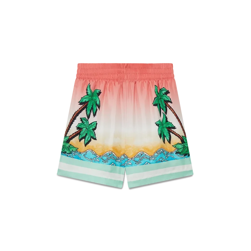 Die Tennis Club Seidenshorts sind ein durchgehend bedrucktes Design mit einem Motiv, das den Tennis Club-Print des Hauses im Surf-Stil neu interpretiert, im Stil einer mit Markern gezeichneten grafischen Skizze, gefertigt aus Seidentwill. Mit elastischem Bund, Seitentaschen in den Beinen, einer aufgesetzten Gesäßtasche und grün-weißen horizontalen Streifen am Saum.
