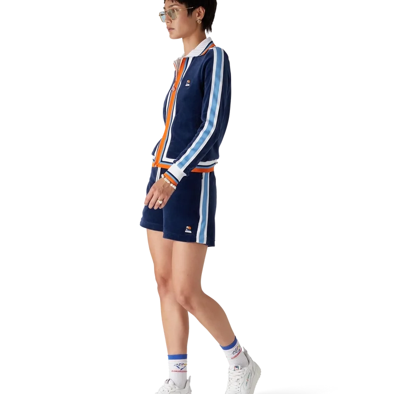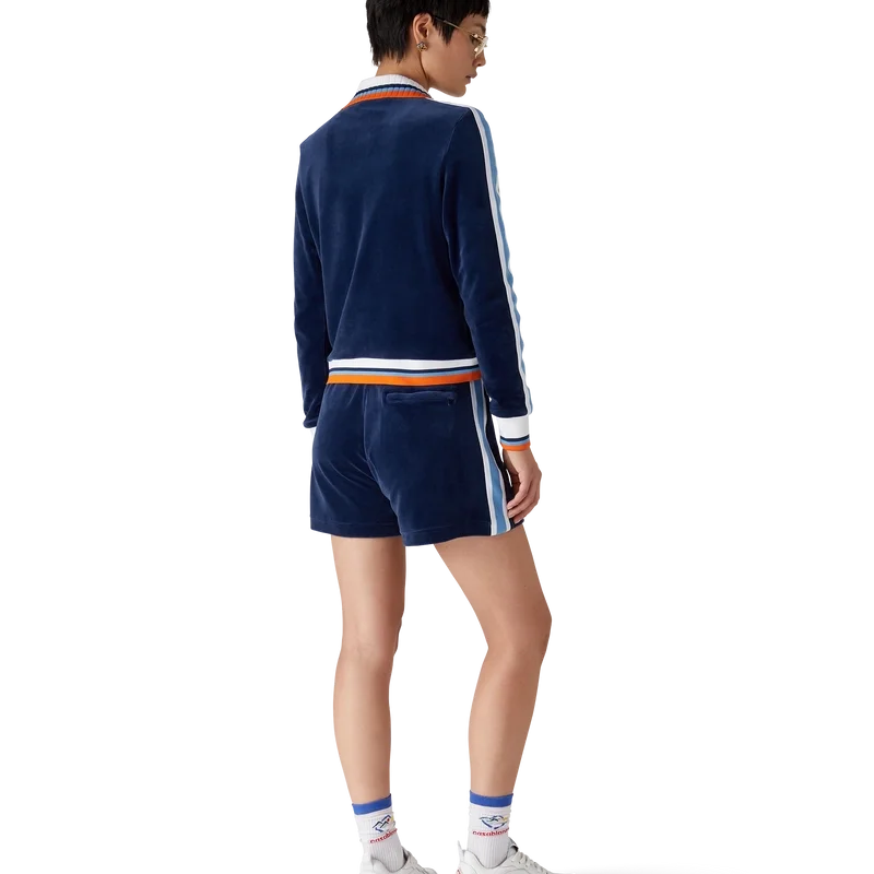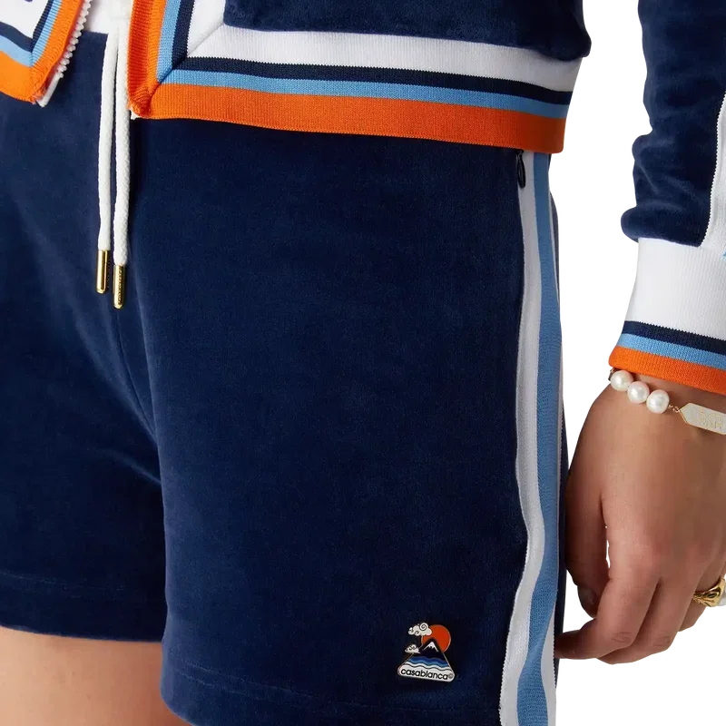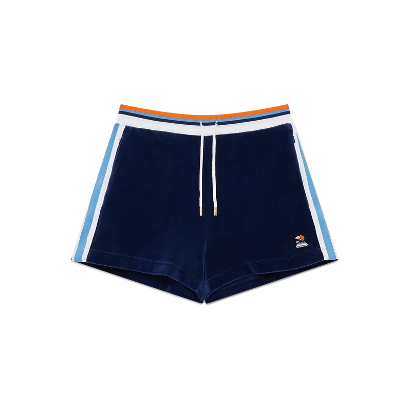 Die Velour Montagne Shorts sind ein Sportbekleidungsmodell aus weichem, strukturiertem Veloursstoff. Mit kontrastierendem elastischem Bund, Kordelzug, Eingrifftaschen, Streifenverzierung an den Seiten und einer aufgesetzten Gesäßtasche.<!–Veloursstoff