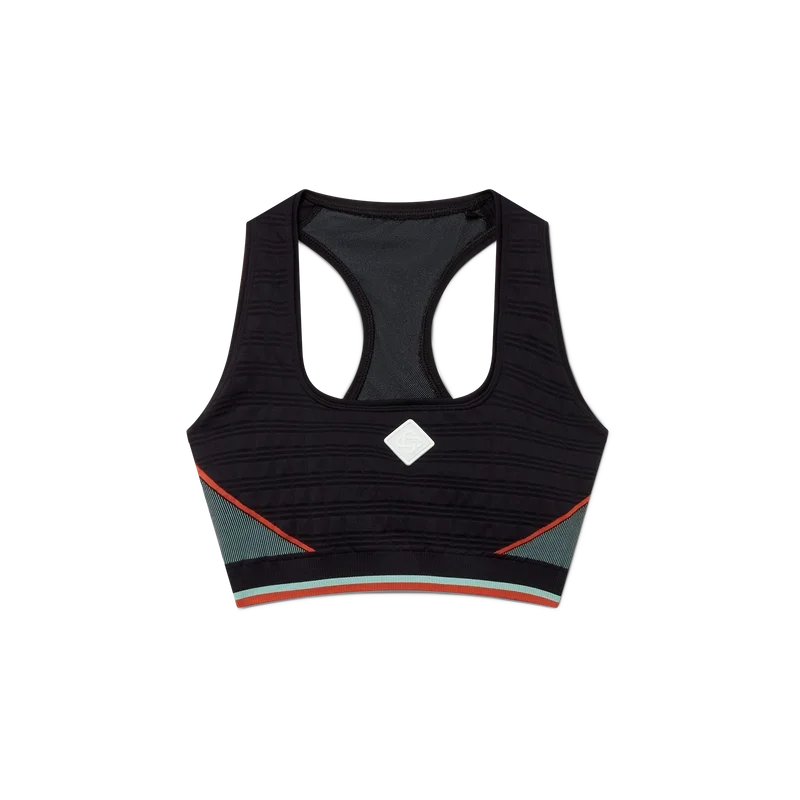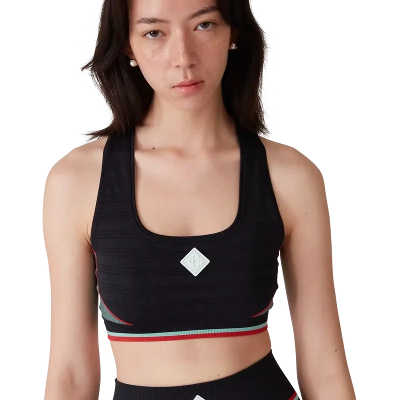 Der nahtlose Sport-BH ist ein von Sportbekleidung inspiriertes Design aus einem nahtlosen, gerippten Stretchstoff. Abgerundet durch ein elastisches Band, einen Racerback, das hauseigene Diamant-Logo in der Mitte und Einsätze.