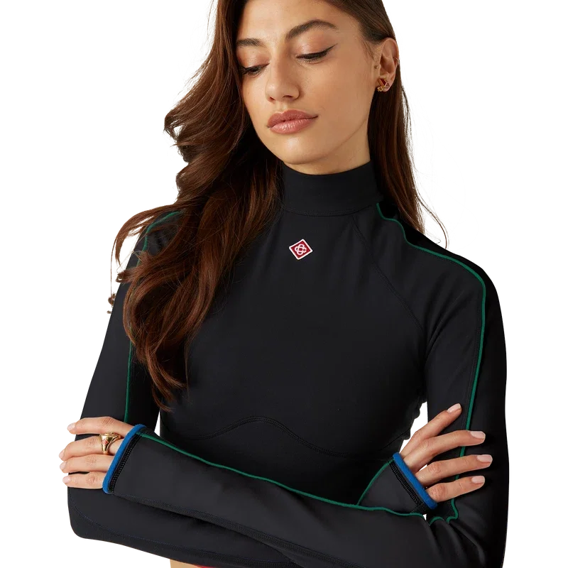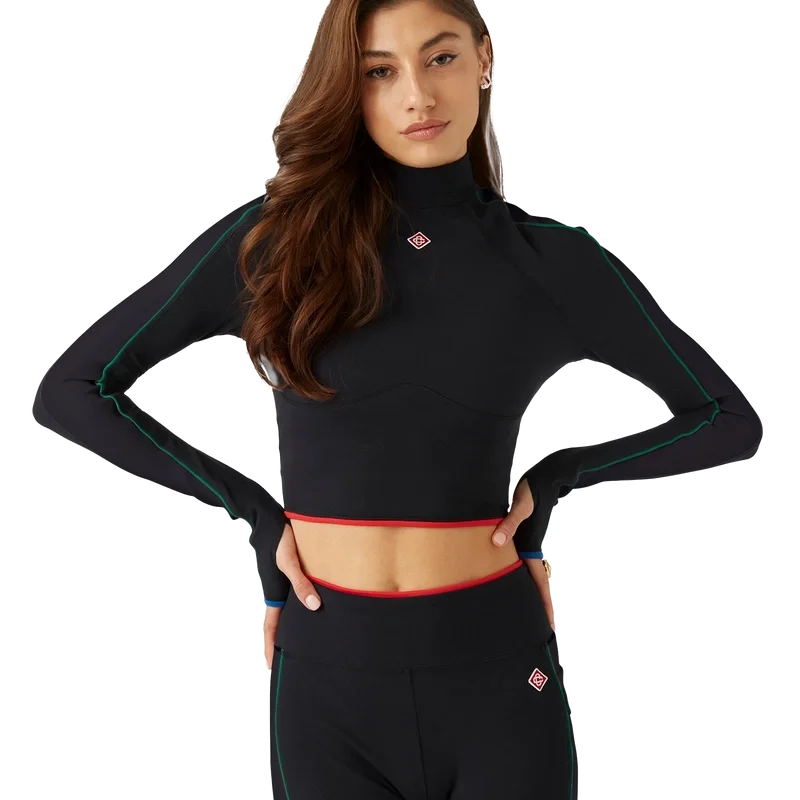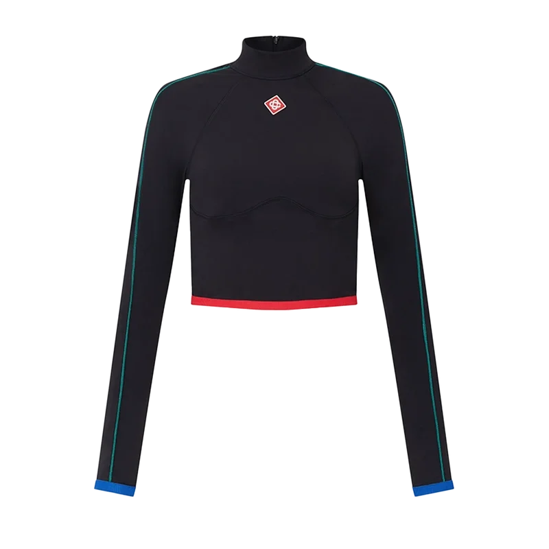 Das Sportoberteil ist ein langärmeliges Activewear-Modell aus elastischem Sportstoff. Mit dem charakteristischen Diamond Monogram des Hauses, einem Poloshirt, weißen Streifen von den Schultern bis zu den Handgelenken und kontrastierenden Details am Saum.