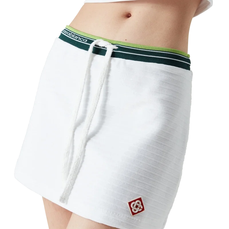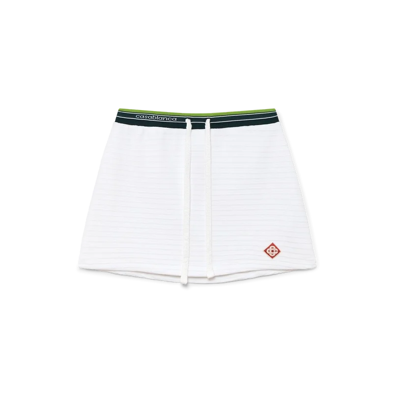 Der strukturierte Velours-Tennisrock ist ein A-Linien-Minirock aus Veloursstoff. Er verfügt über einen gestreiften, elastischen Bund mit dem Casablanca-Logo, einen Kordelzugverschluss und das charakteristische Rautenlogo des Hauses am Saum.