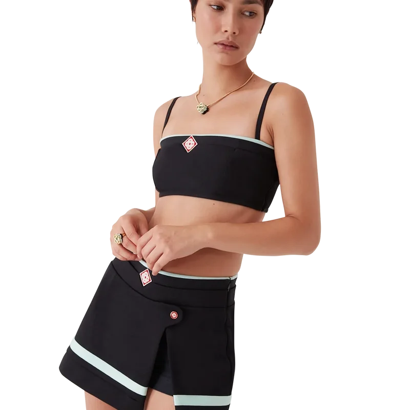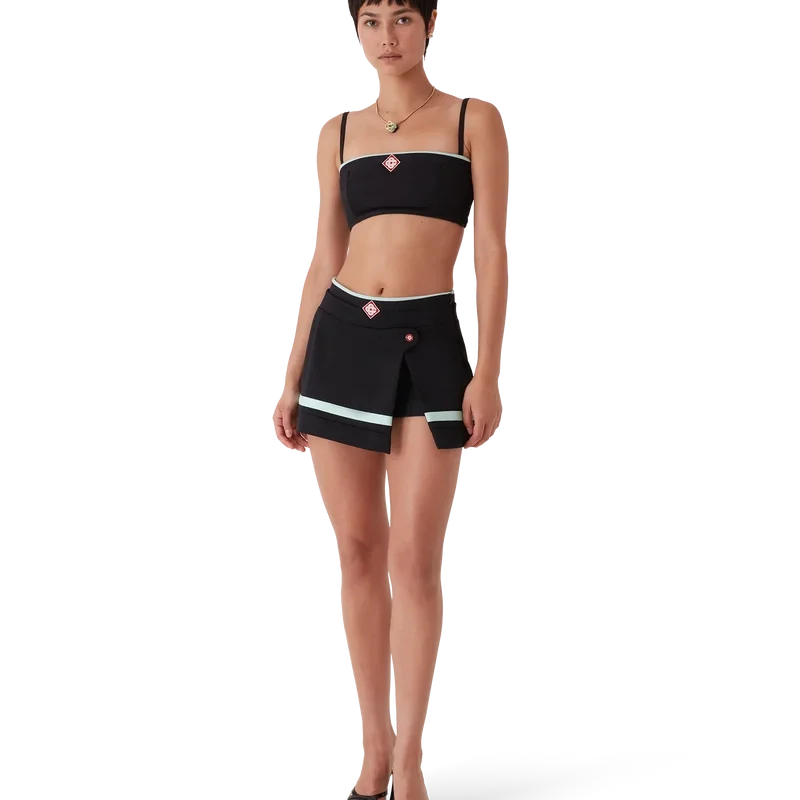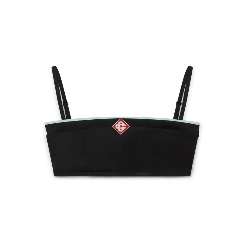 Die Tricot-Bralette ist ein ärmelloses, von Sportbekleidung inspiriertes Design mit dem charakteristischen Diamond Monogram des Hauses in der Mitte. Dieses Modell ist aus Tricot-Stoff gefertigt und verfügt über Spaghettiträger sowie gestreifte Kanten.