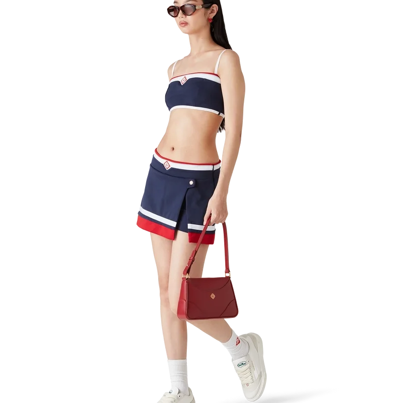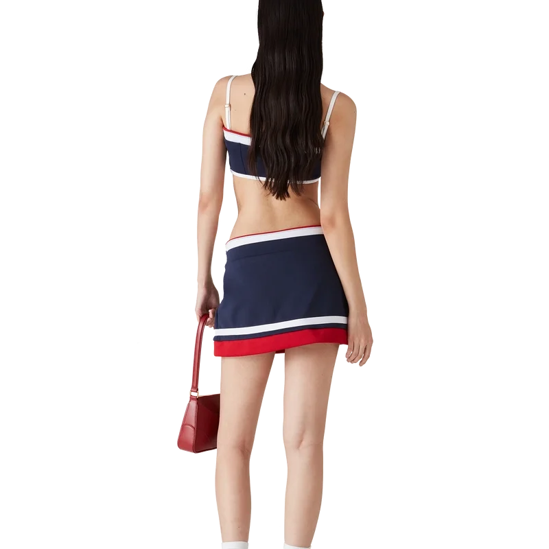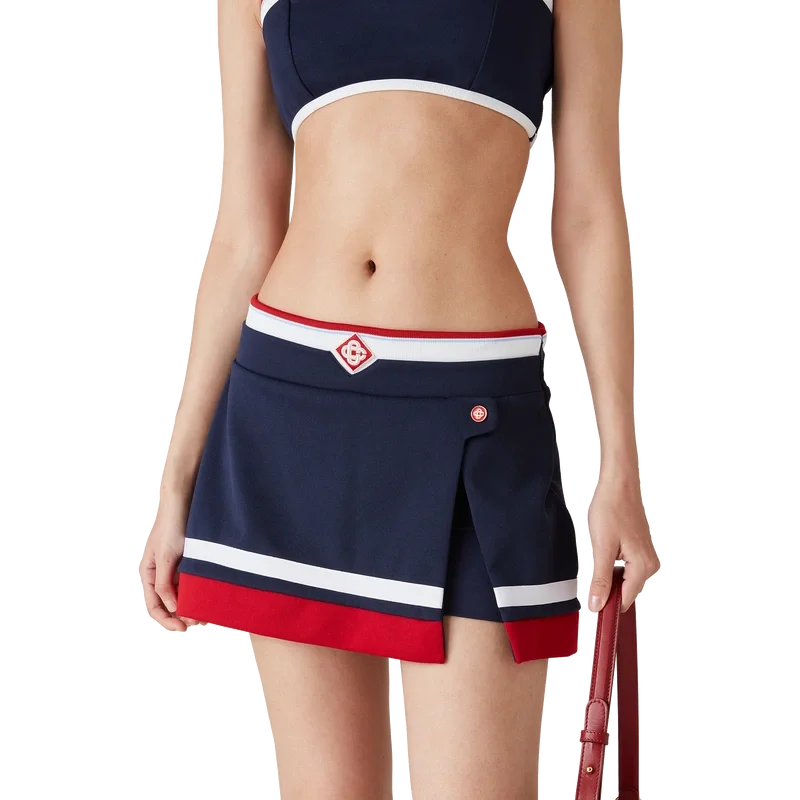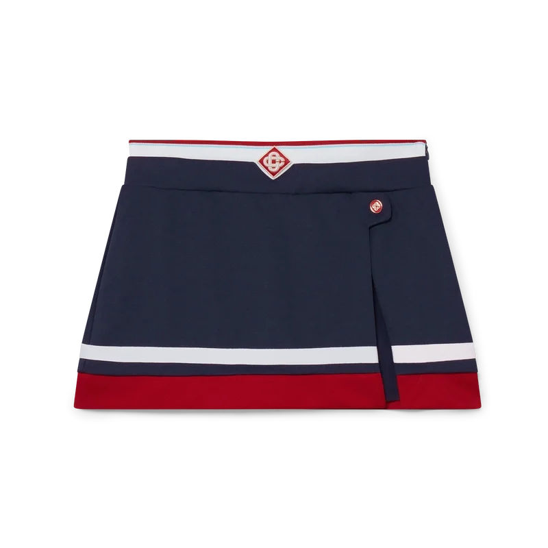 Der Trikot-Minirock ist ein kurzes Modell aus Trikotstoff. Er verfügt über einen Bund mit dem charakteristischen Rautenlogo des Hauses, eine integrierte Unterhose, einen Schlitz und einen seitlichen Reißverschluss.
