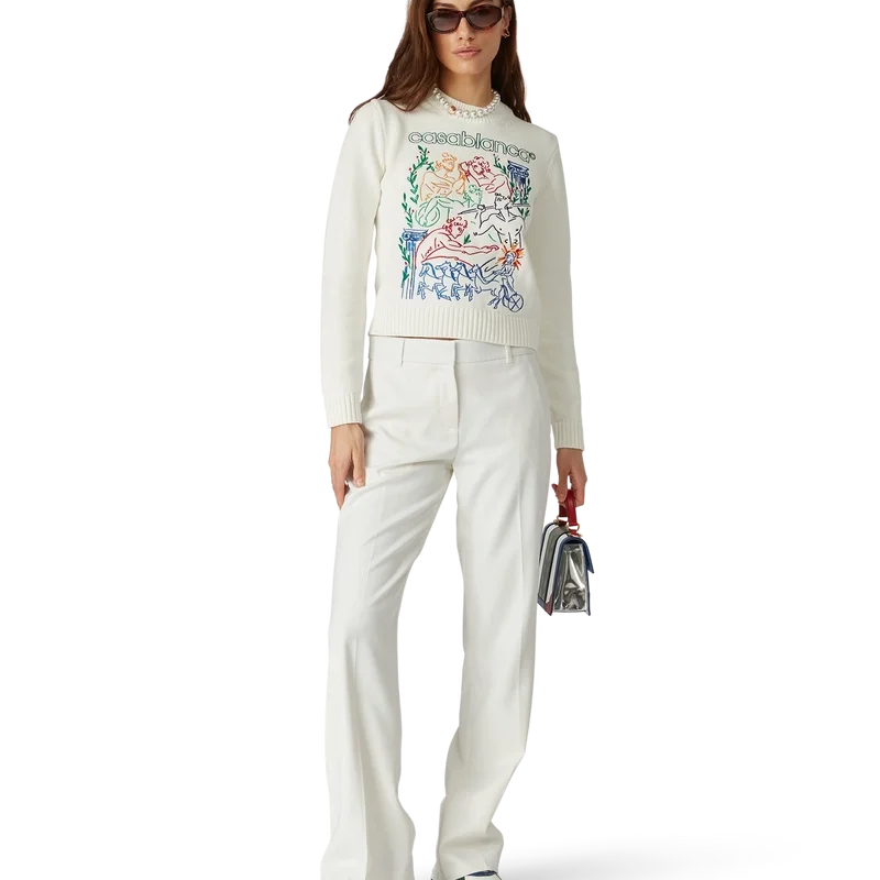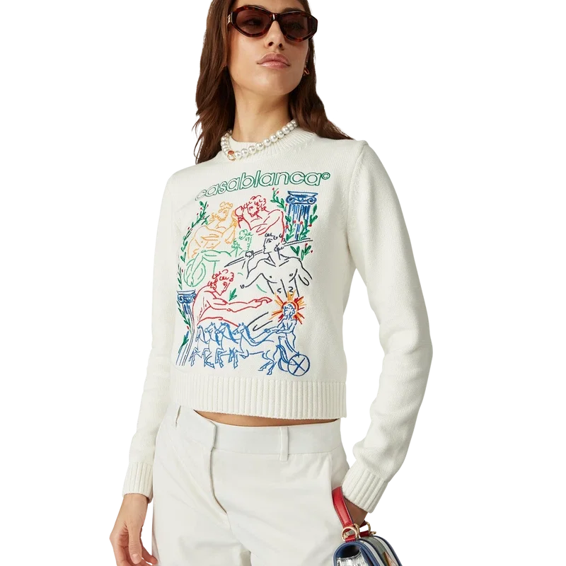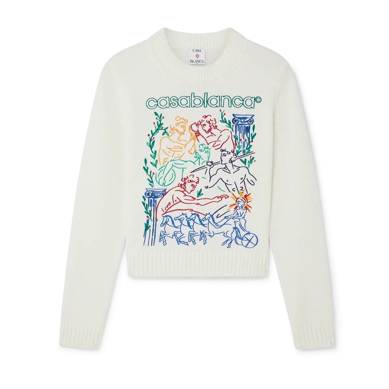 Der bestickte Pullover ist ein langärmeliges Modell aus gestricktem Baumwollstoff mit dem saisonalen Stickmotiv des Hauses. Abgerundet durch einen klassischen Rundhalsausschnitt sowie gerippte Bündchen, Kragen und Saum.