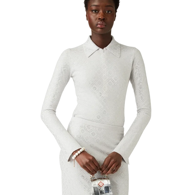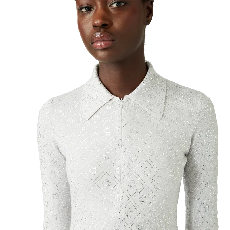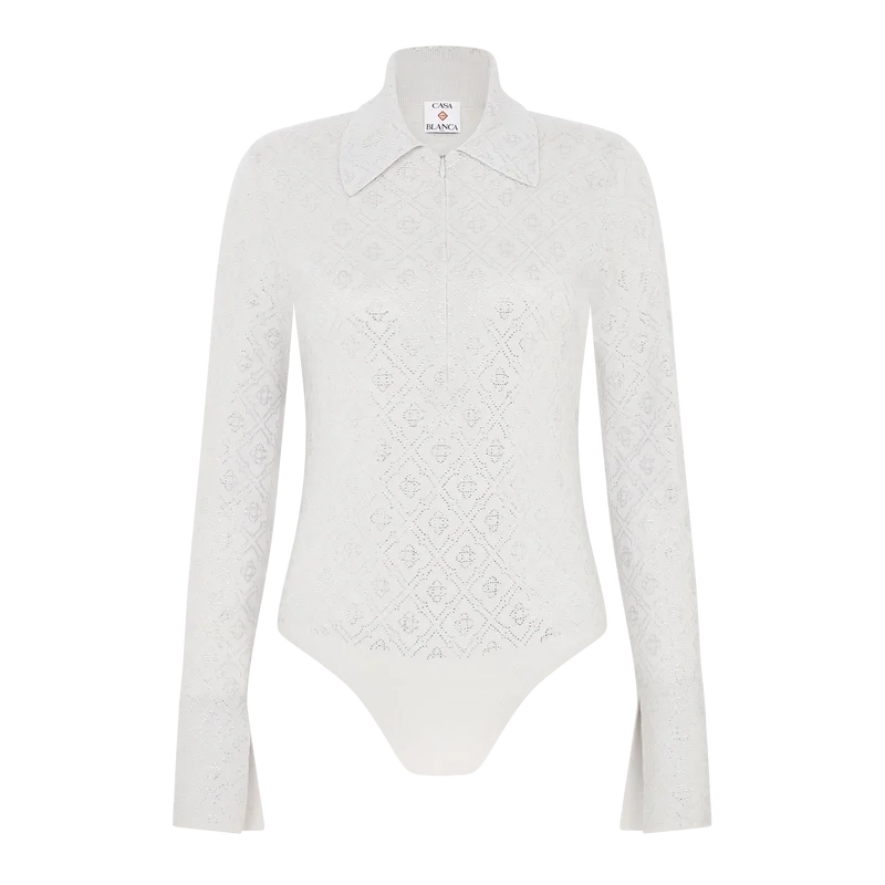 Der Crystal Monogram Strick-Body ist ein figurbetontes, langärmeliges Einteiler-Design aus Merinowolle mit dem Crystal Monogram des Hauses. Mit geschlitzten, ausgestellten Ärmelbündchen, halbem Reißverschluss, Stehkragen, hoch geschnittenen Beinen und Druckknopfverschluss.