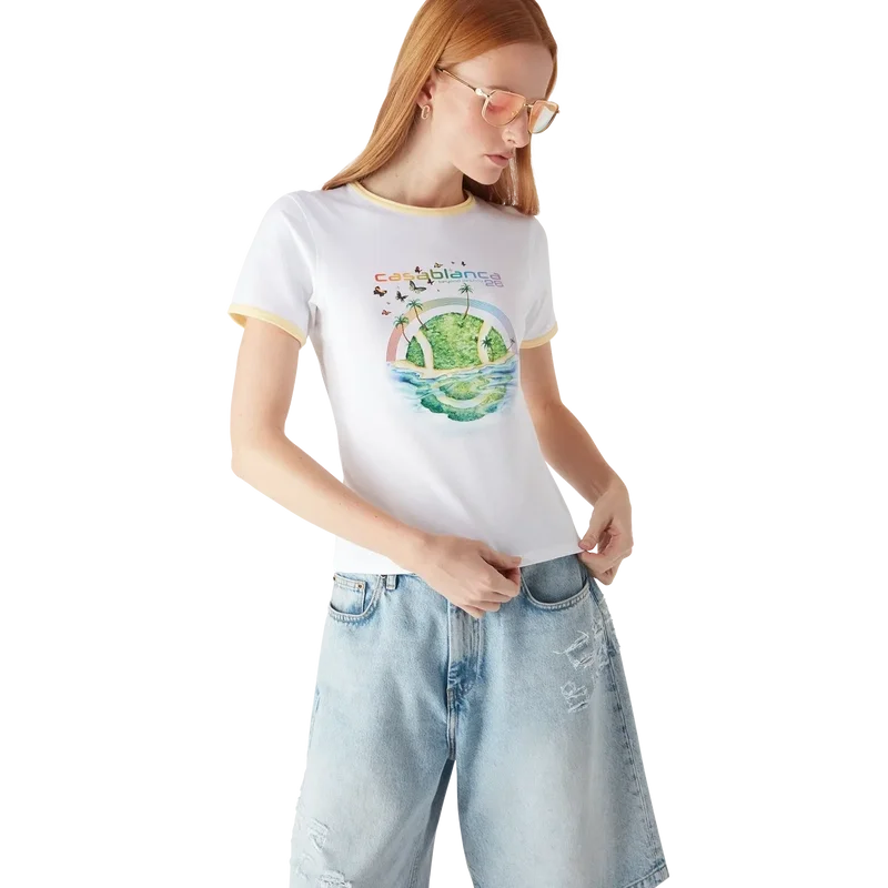 Das Beyond Destiny Longline Ringer T-Shirt hat eine schmale Passform und zeigt das aktuelle Beyond Destiny-Motiv der Saison. Durch Halbton-Verläufe entsteht Tiefe, und das von Videospielen inspirierte Branding sorgt für einen verspielten, futuristischen Look. Abgerundet wird das Design durch kontrastierende Rippbündchen am Rundhalsausschnitt und an den Ärmelbündchen, einen verlängerten Saum sowie das Casablanca-Logo als Farbverlaufstext auf der Brust.