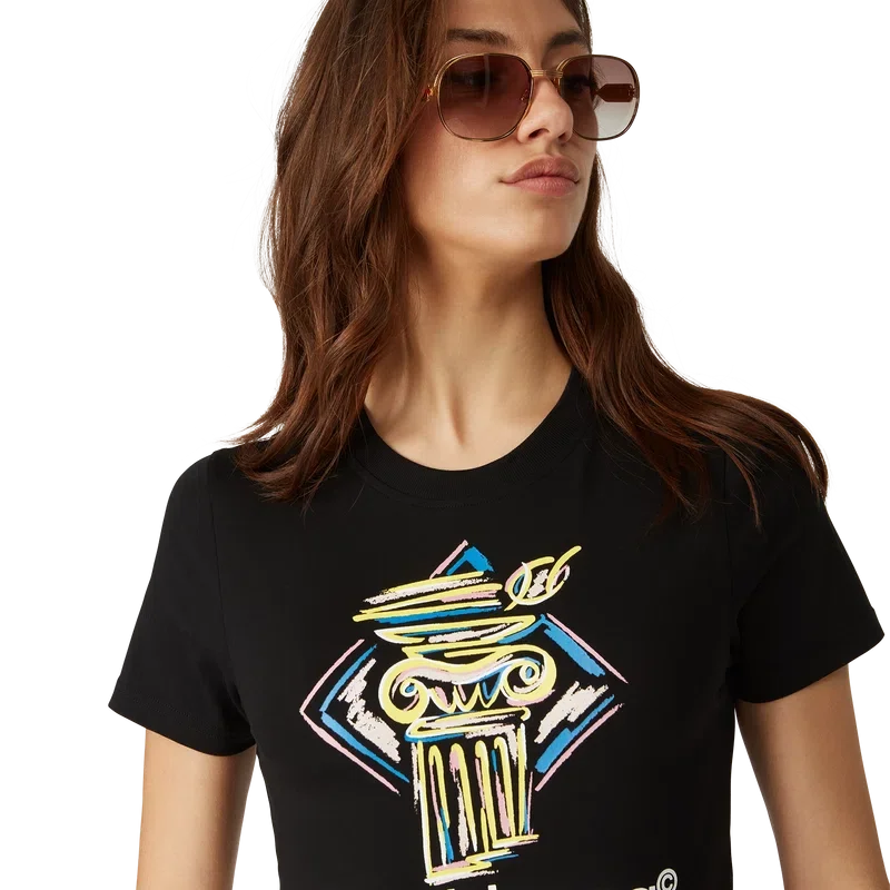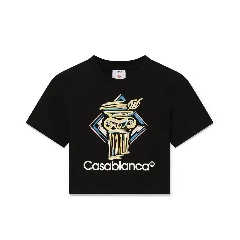 Das Diamond Column Baby T-Shirt ist ein kurzes, kurzärmeliges T-Shirt mit Aufdruck aus einem Baumwollmischgewebe, das mit der für das Haus typischen Buntstift-Ikonografie einer Säule verziert ist. Abgerundet durch einen klassischen Rundhalsausschnitt – so geschnitten, dass es über dem Bauchnabel sitzt.