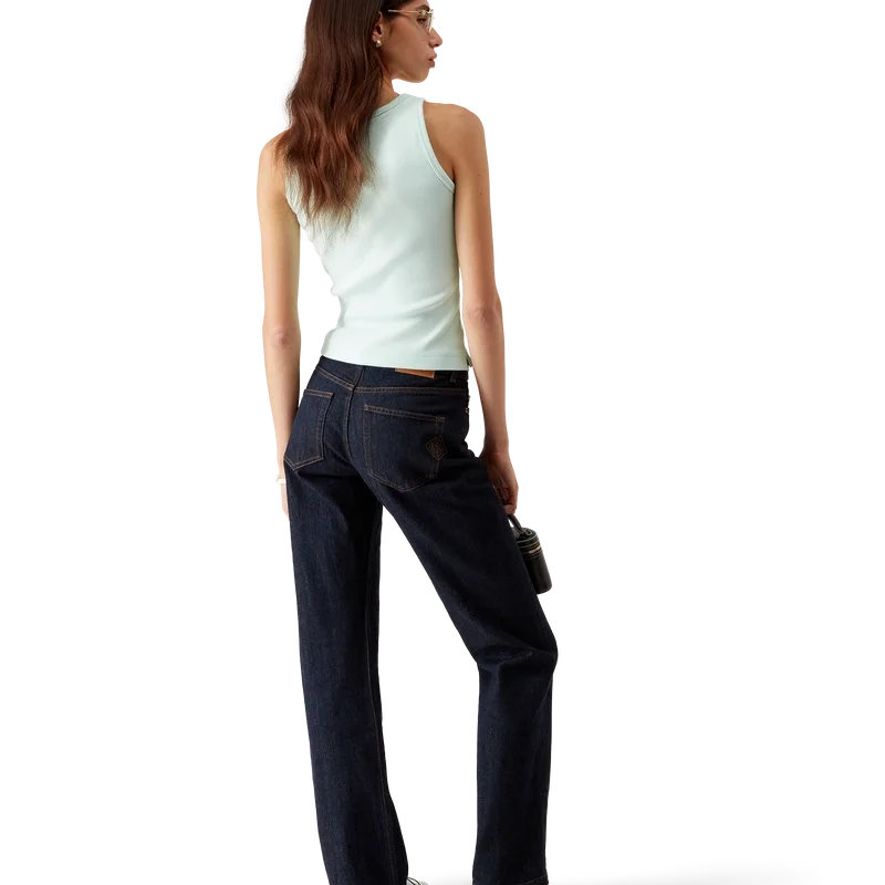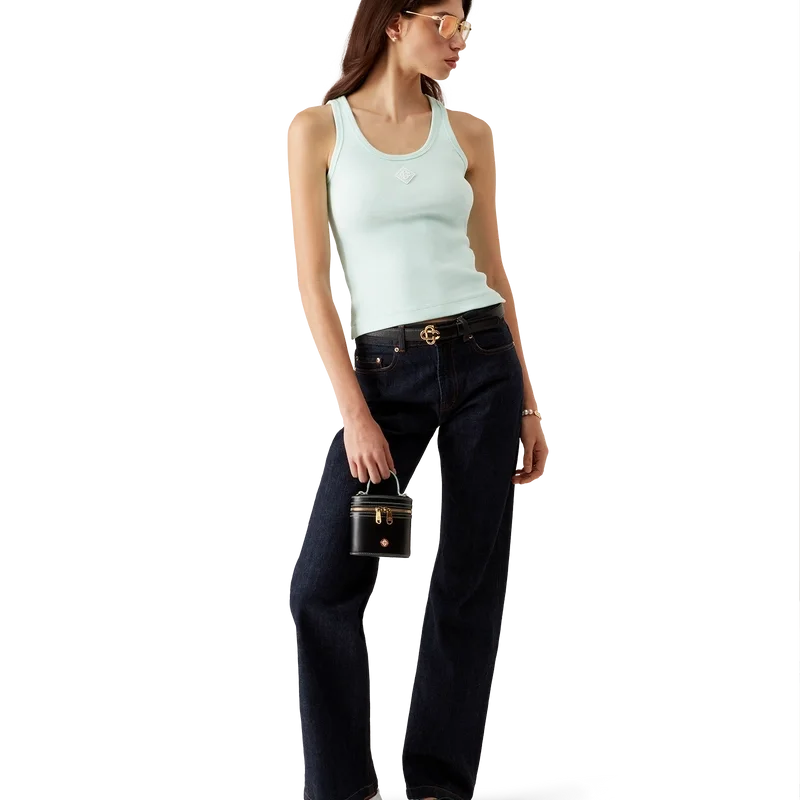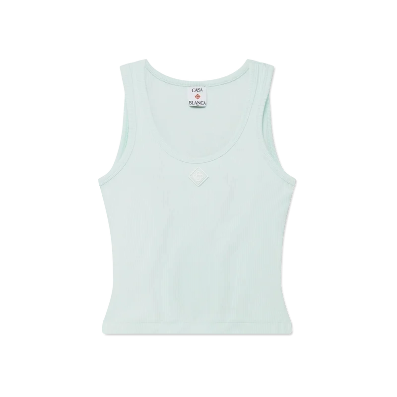 Das gerippte Jersey-Tanktop ist ein ärmelloses, figurbetontes Modell in kurzer Passform, gefertigt aus geripptem Jersey-Stoff. Es ist mit einem silikonierten, ineinander verschlungenen CC-Logo-Aufnäher, einem U-Ausschnitt und weißen Kontraststreifen in Wellenmuster an den Kanten um den Halsausschnitt und die Armausschnitte versehen.