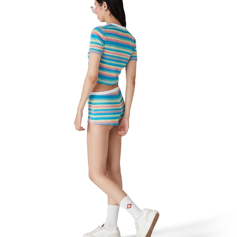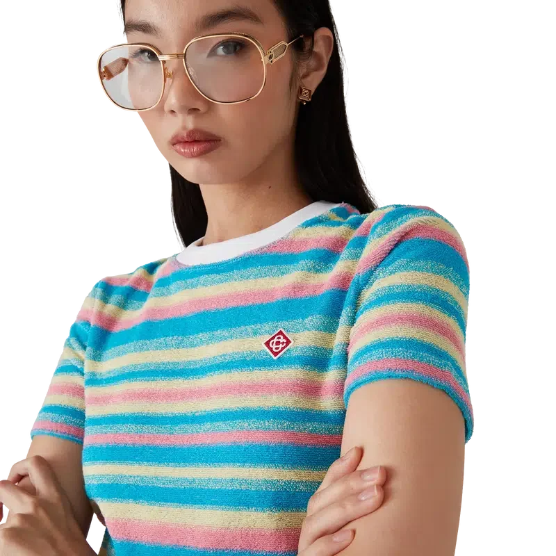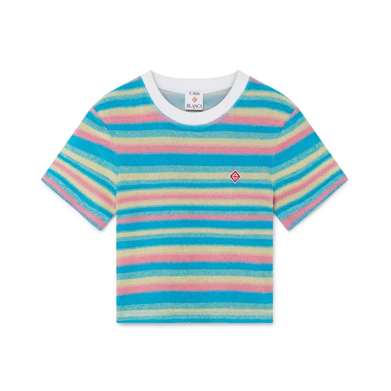 Das gestreifte Frottee-Oberteil ist ein kurzärmeliges Modell aus Frottee-Stoff und verfügt über das charakteristische Diamant-Logo des Hauses. Abgerundet durch einen klassischen Rundhalsausschnitt.
