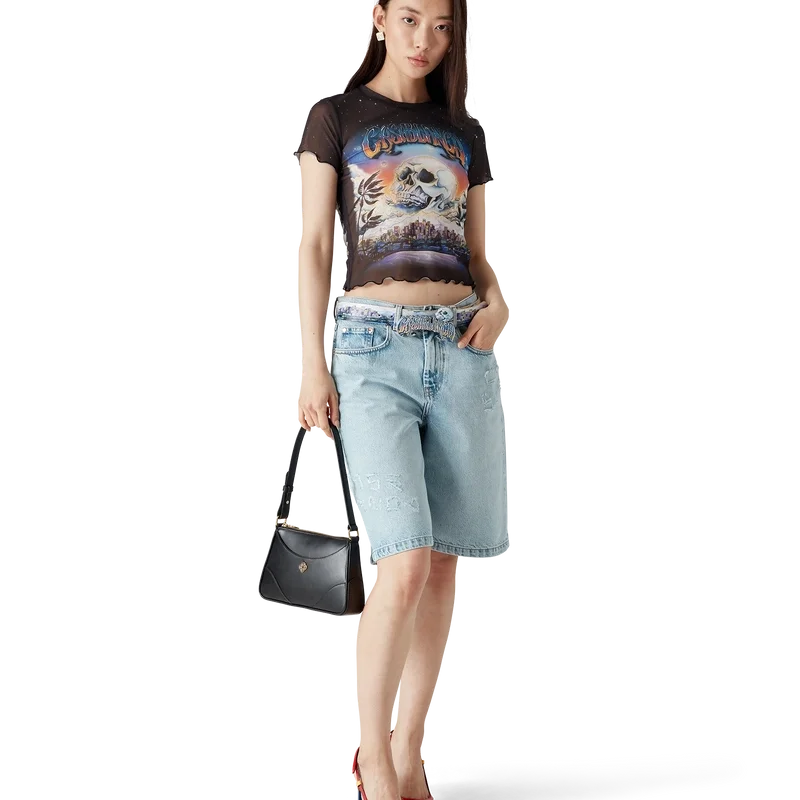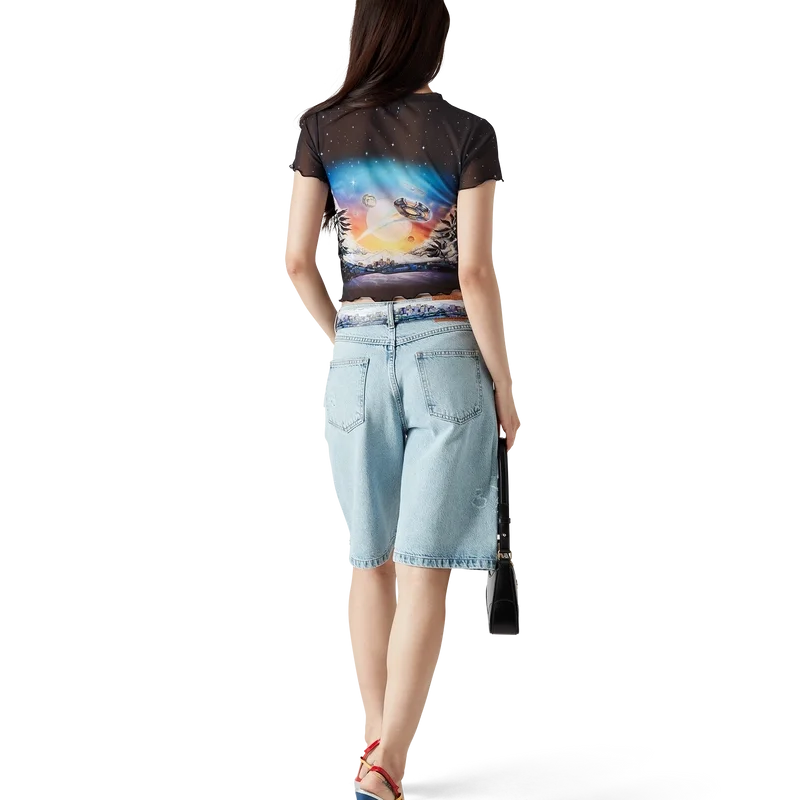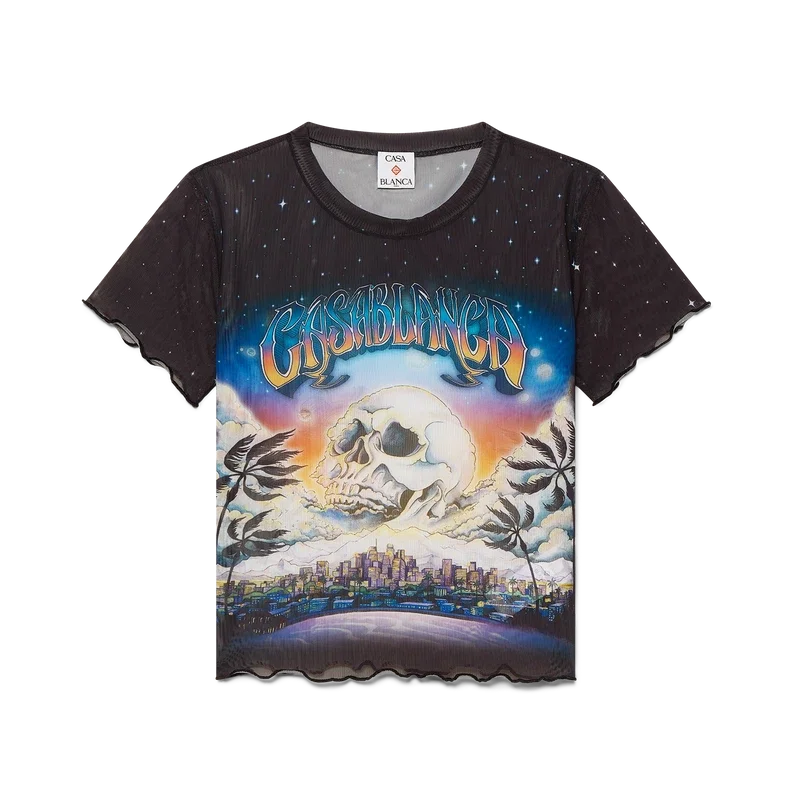 Das La Pramonition Mesh-T-Shirt ist ein bedrucktes Kurzarm-Modell aus Mesh-Stoff mit charakteristischem Artwork, inspiriert von einer unheimlichen Vision der Skyline von La bei Nacht, mit UFO-Elementen, die an Vintage-Sci-Fi-Inspirationen anknüpfen.