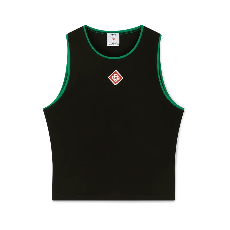 Das Tanktop mit Diamant-Logo ist ein kurz geschnittenes, ärmelloses Modell aus Baumwollstoff. Es ist mit dem charakteristischen Diamant-Logo des Hauses, grünen Kanten und einem klassischen Rundhalsausschnitt versehen. Es ist so geschnitten, dass es über dem Bauchnabel sitzt.