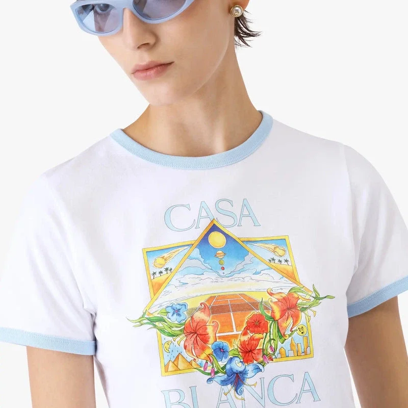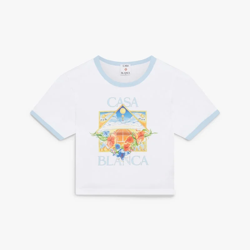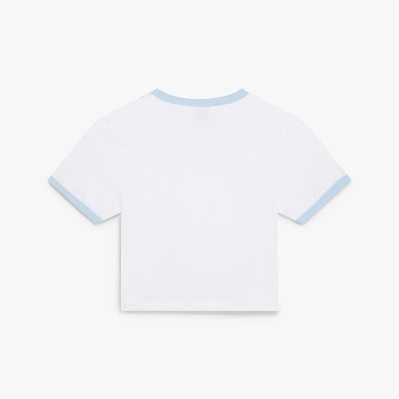 Das Tennis Landscape Ringer Baby-T-Shirt mit kurzen Ärmeln ist ein kurz geschnittenes Modell mit dem saisonalen Tennis-Landschafts-Motiv, bei dem miteinander verbundene Rahmen Nischen mit verschiedenen Szenen bilden, die durch den Fokus auf den Sport die Transzendenz von Zeit und Ort beschreiben. Abgerundet durch einen Rundhalsausschnitt, kontrastierende gerippte Ringer-Details und eine taillierte Silhouette.