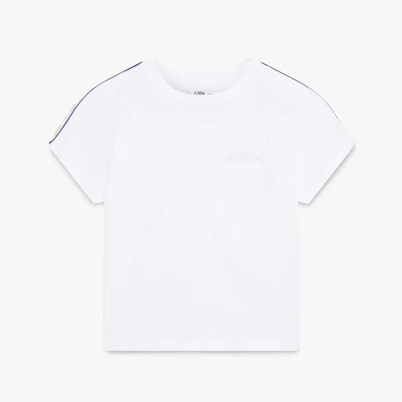 Das weiße Laurel-Kurzarm-T-Shirt besticht durch ein raffiniertes Design mit dem charakteristischen Casablanca-Logo des Hauses und dem Laurel-Motiv. Es verfügt über einen klassischen Rundhalsausschnitt, Ärmel im Raglan-Stil, kontrastierende Laurel-Streifen vom Kragen bis zu den Ärmeln sowie eine schmale Silhouette.