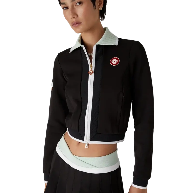 Die Viskose-Trainingsjacke ist ein Sportbekleidungsmodell aus Viskose-Stoff. Mit Reißverschluss, kontrastierendem Rippkragen, gerippten Bündchen, Saum und Knopfleiste sowie Taschen.