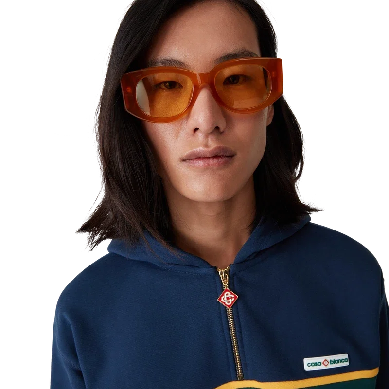 Die markante orangefarbene Acetatrahmenkonstruktion der Memphis-Sonnenbrille prägt diese rechteckige Sonnenbrille. Hier ist das charakteristische Casablanca-Diamond Monogram-Logo an den Bügeln angebracht. Die Verlaufsgläser bieten 100 % UV-Schutz und das Modell wird komplett mit einer Casablanca-Box, einem Reinigungstuch und einem Garantieschein geliefert.