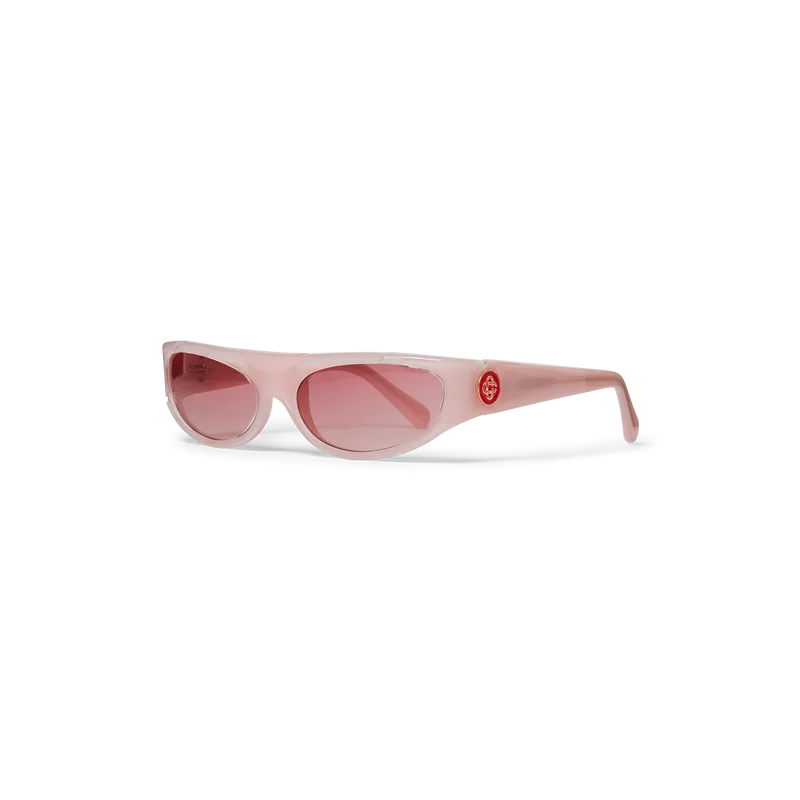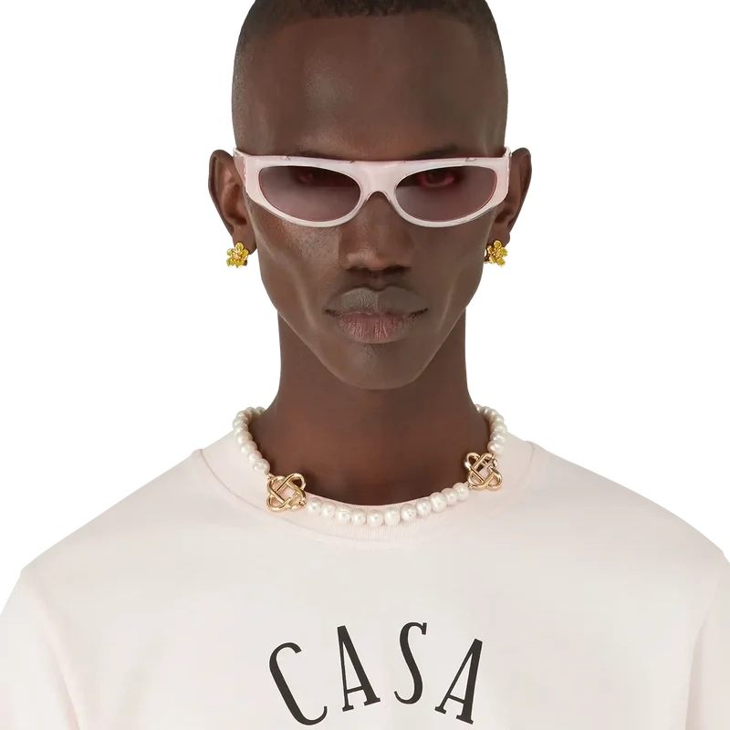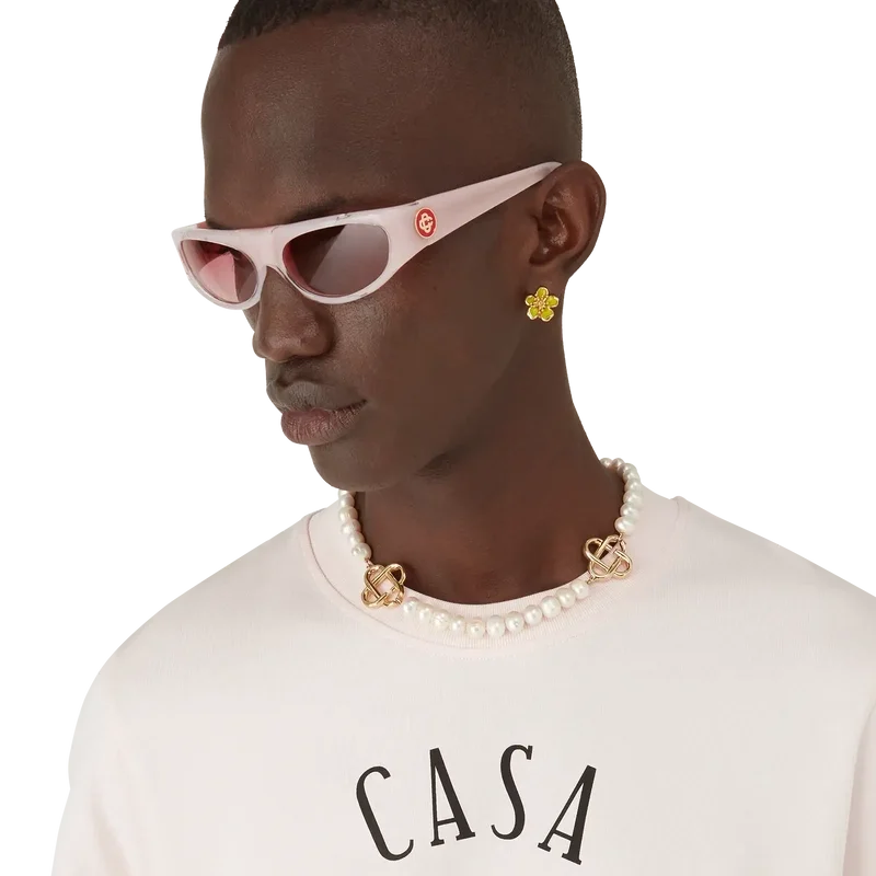 Die rosa Sportsonnenbrille verfügt über einen rechteckigen Rahmen aus Acetat. Das Modell ist an den Bügeln mit dem ineinander verschlungenen CC-Logo des Hauses versehen. Die rosa Gläser bieten Schutz, und das Modell wird komplett mit einem Casablanca-Etui, einem Reinigungstuch und einem Garantieschein geliefert.