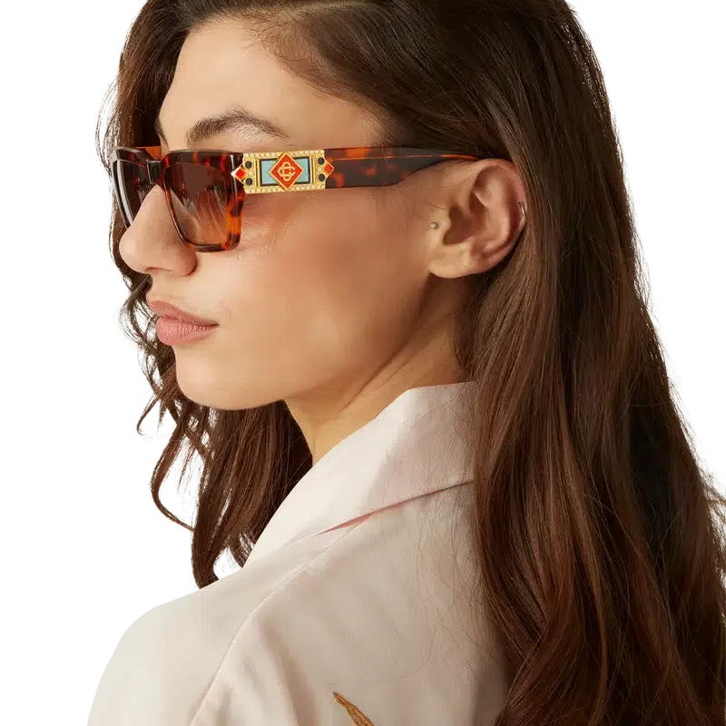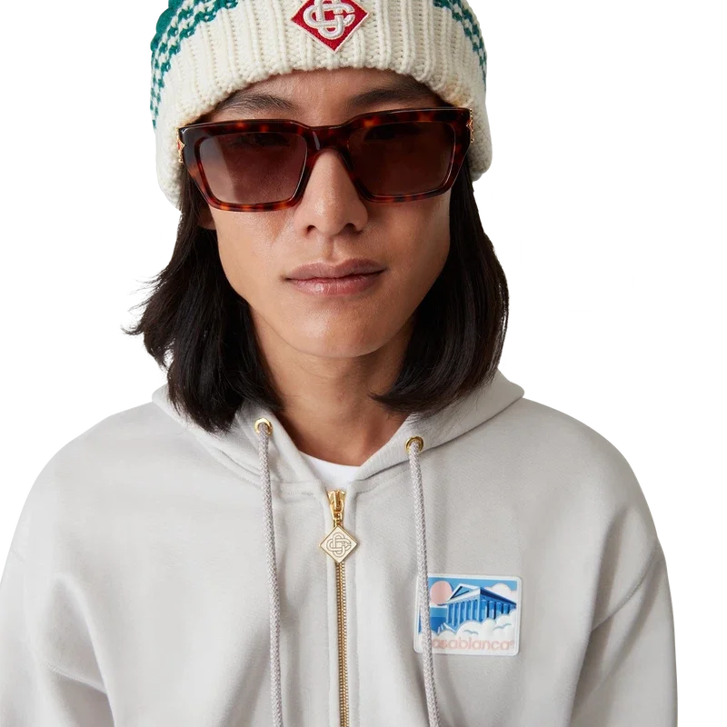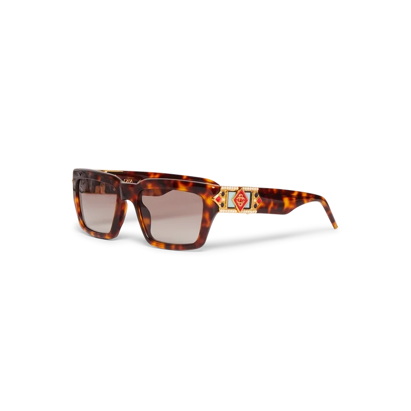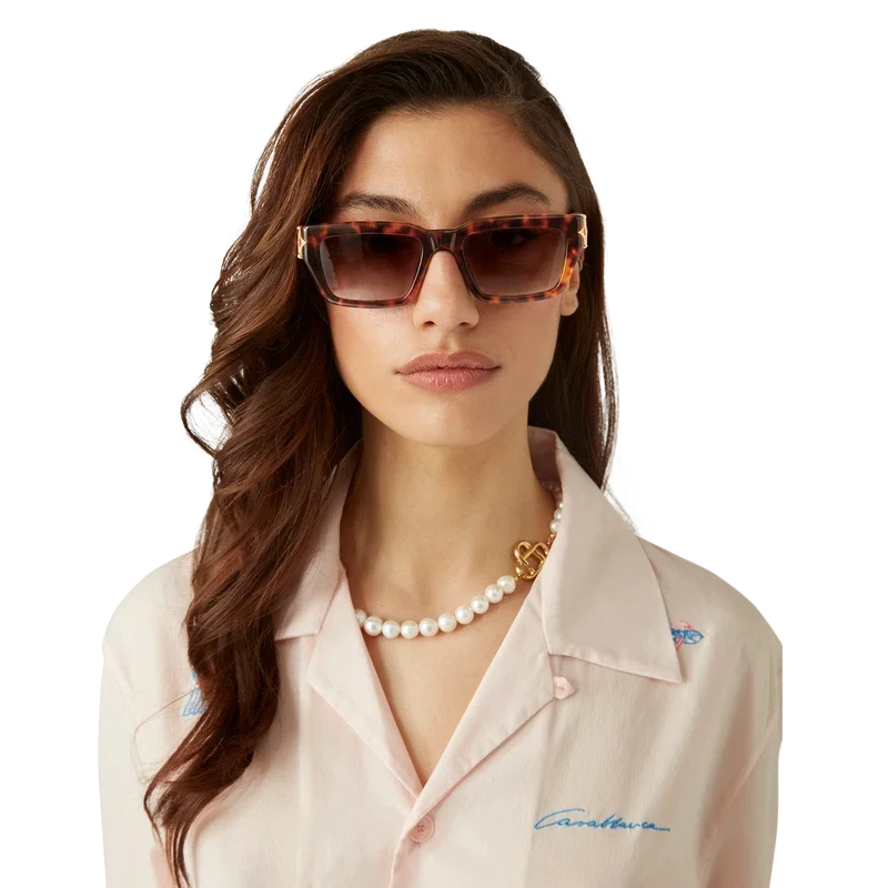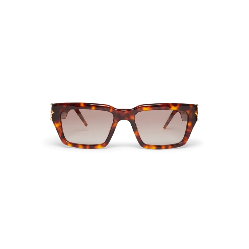 Die Tortoiseshell Square Metope Sonnenbrille ist ein quadratisches Modell aus Acetat und vergoldetem Messing. Das charakteristische Casablanca-Diamond Monogram-Logo befindet sich an den Bügeln. Die Gläser bieten 100 % UV-Schutz und das Modell wird komplett mit einer Casablanca-Box, einem Reinigungstuch und einem Garantieschein geliefert.