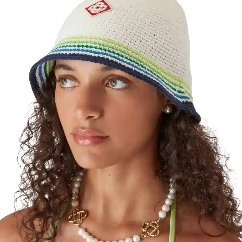 Die Beach Club Cap ist eine raffinierte Mütze im Bucket-Stil aus gehäkelter Baumwolle mit dem charakteristischen Diamant-Logo des Hauses in der Mitte. Abgerundet durch eine blau, grün, gelb und weiß gestreifte Krempe.