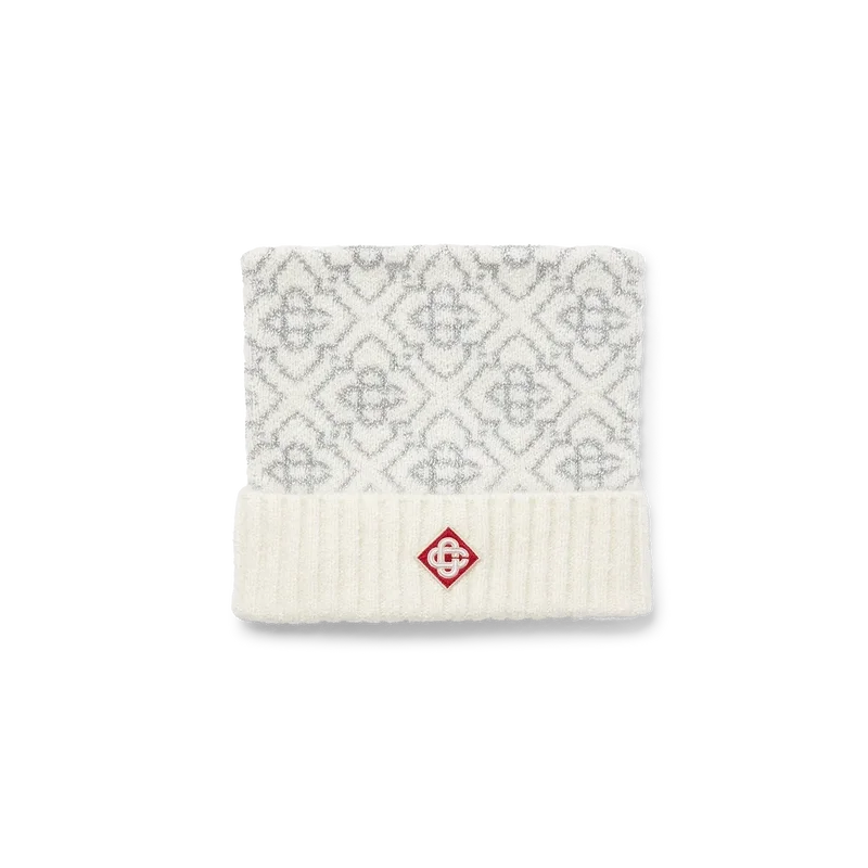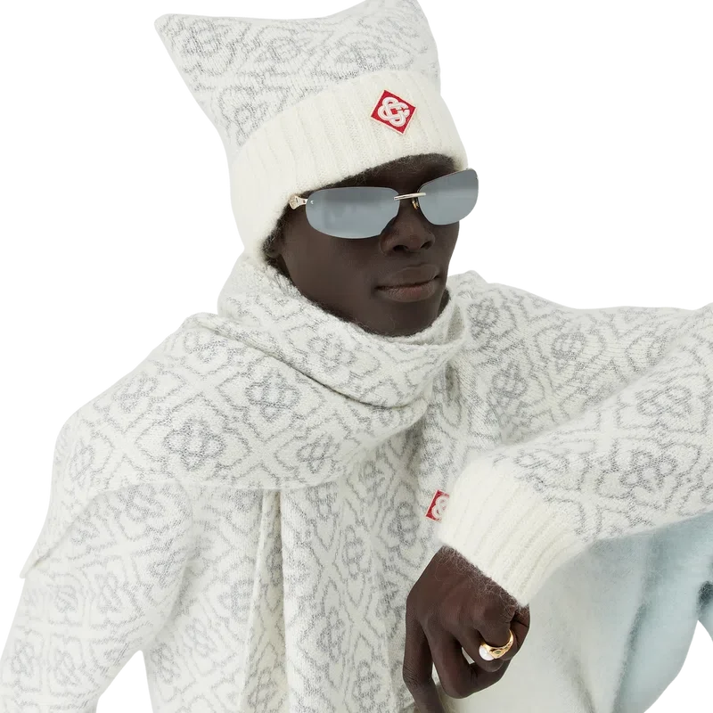 Die Ski-Mütze ist ein raffiniertes Design aus Mohairstoff mit dem weißen und grauen Monogramm-Motiv des Hauses, inspiriert von Frostmustern an traditionellen japanischen Bauernhausfenstern. Das Design, das sich an Schneekristallen auf Bambushainen orientiert, verkörpert die Eleganz von Apras-Sport.