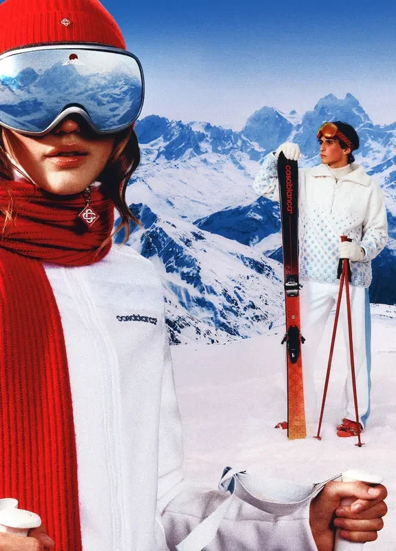 Der Ski-Schal ist ein raffiniertes Design aus weißem Rippstrick aus Wolle, inspiriert vom unberührten Pulverschnee, der die ländlichen Dörfer Hokkaidos in Japan bedeckt. Das Design erinnert an frostbedeckte Bambushaine und Bauernhäuser, die in alpinen Tälern eingebettet sind, und verkörpert mit seiner präzisen Verarbeitung die Apras-Sport-Kodizes des Hauses.