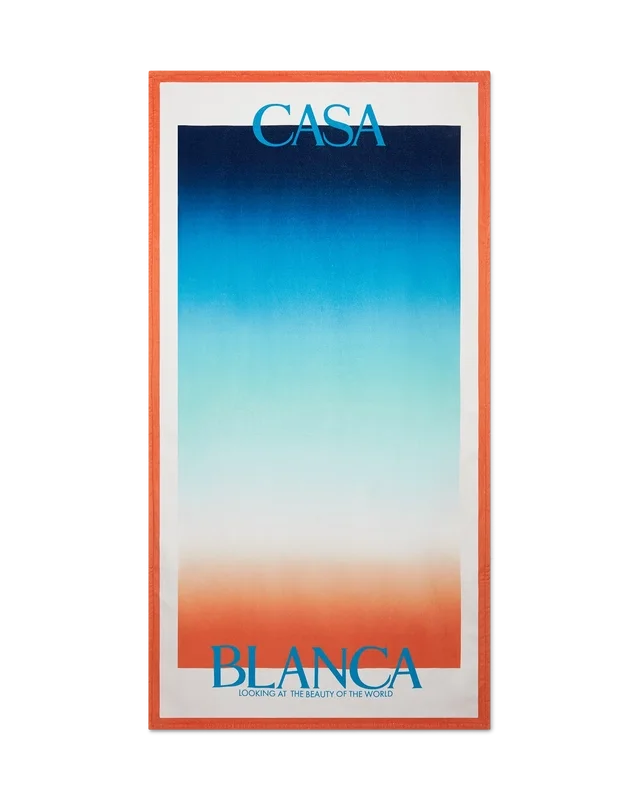 Das Gradient-Strandtuch ist ein bedrucktes Design aus Baumwollfrottee mit dem Farbverlauf der Saison. Abgerundet wird es durch das gestapelte Logo des Hauses und einen marineblauen Rand.