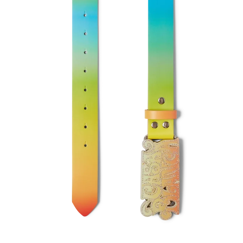 Der La Musique Gürtel ist ein mehrfarbiges Design mit Farbverlauf, das sich durch einen von den 70er Jahren inspirierten psychedelischen Druck und leuchtende Farben auszeichnet, die eine Hommage an Bootsy Collins’ legendären Beitrag zur Funk-Musikszene darstellen. Er ist aus Kalbsleder gefertigt und mit einer lackierten Messingschnalle versehen, die das Casablanca-Logo in einer von den 70er Jahren inspirierten Schriftart zeigt.