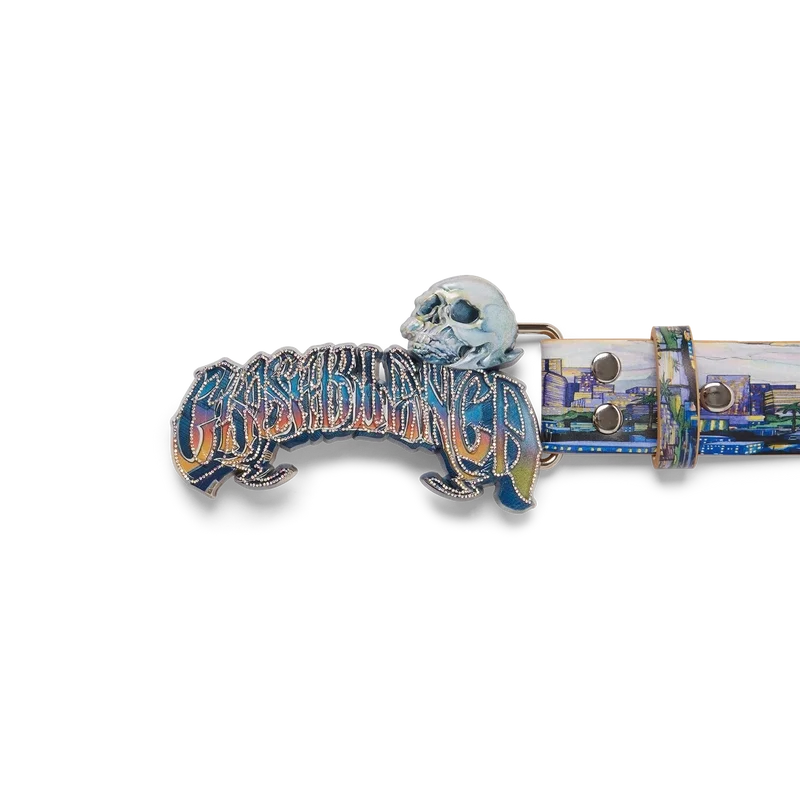 Der La Premonition Gürtel ist ein Design mit dem saisonalen Kunstwerk des Hauses, inspiriert von einer unheimlichen Vision der Skyline von La bei Nacht, mit UFO-Elementen, die an Vintage-Sci-Fi-Inspirationen anknüpfen, gefertigt aus Kalbsleder. Abgerundet wird er durch eine lackierte Messingschnalle mit handgezeichneter Typografie des Casablanca-Logos, inspiriert von der in Tattoos verwendeten gotischen Schriftart, im Farbverlauf der Saison und einem Totenkopf.