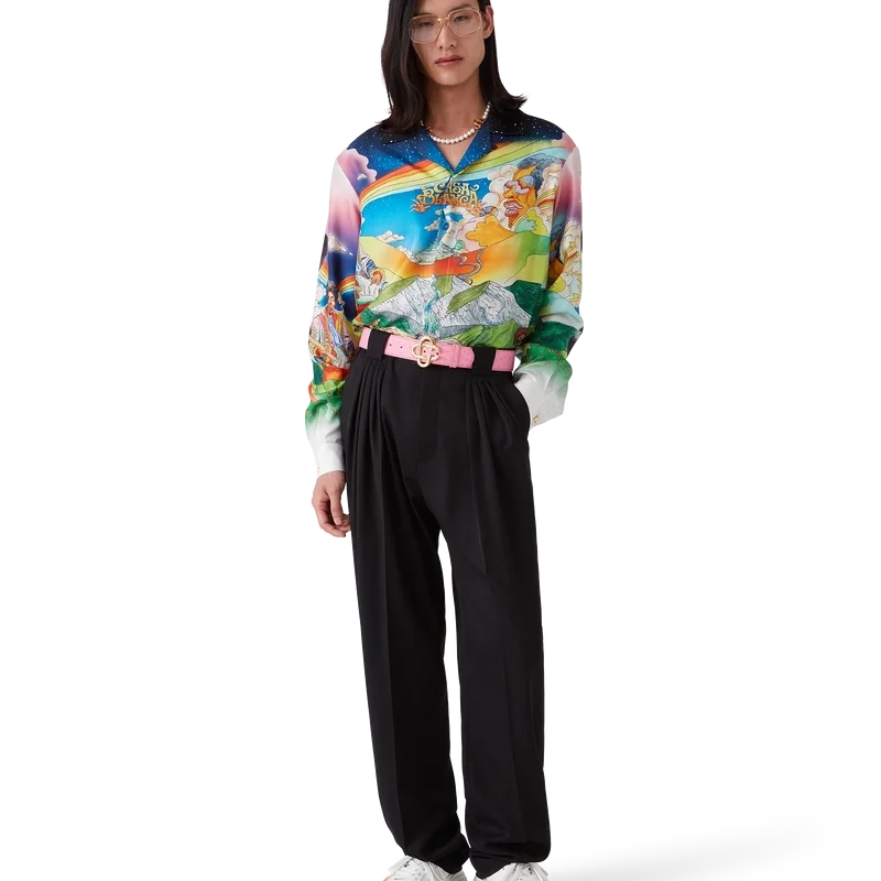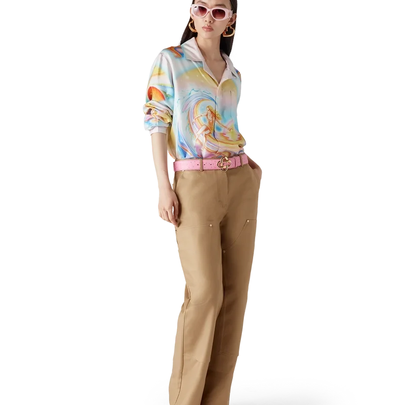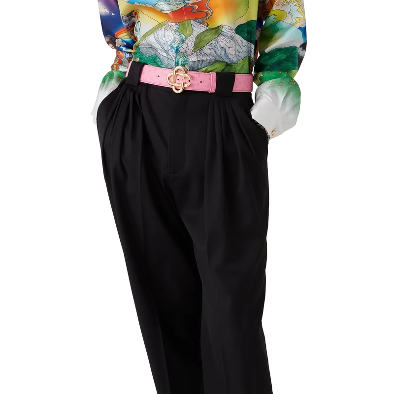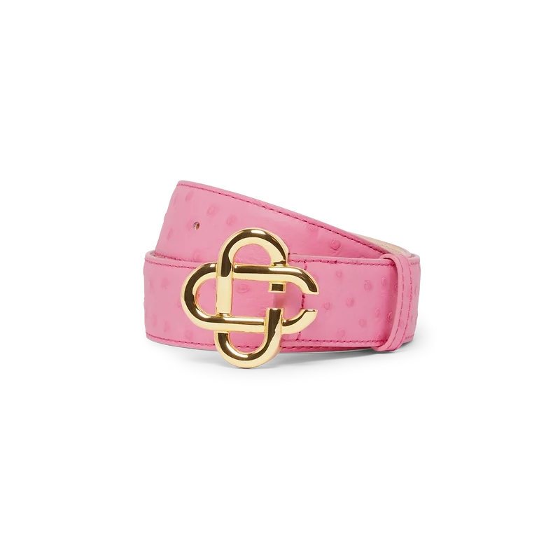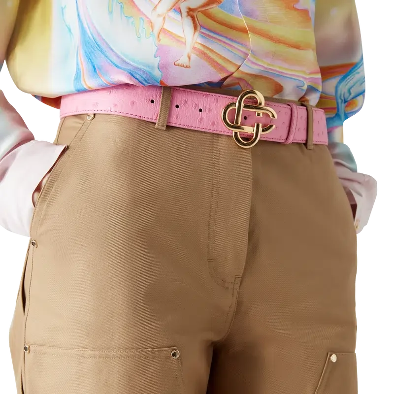 Der rosa Gürtel mit geprägtem CC-Logo für Herren verfügt über die charakteristische, ineinander verschlungene CC-Schnalle des Hauses und einen Riemen aus italienischem Ziegenleder. Abgerundet wird das Design durch eine Prägung im Straußenleder-Look.