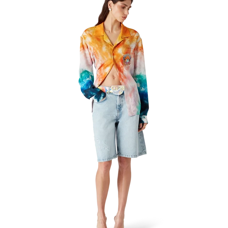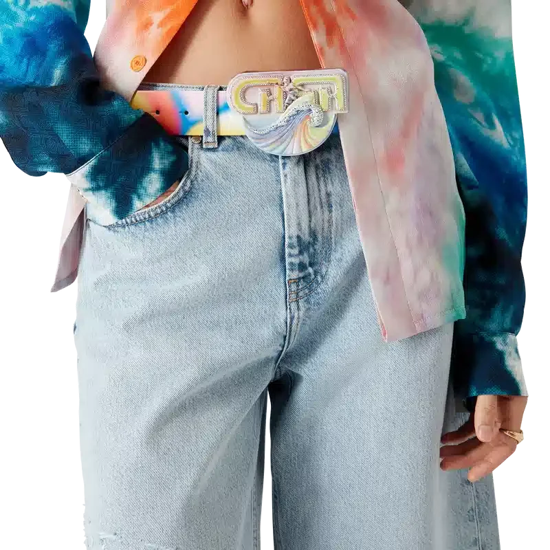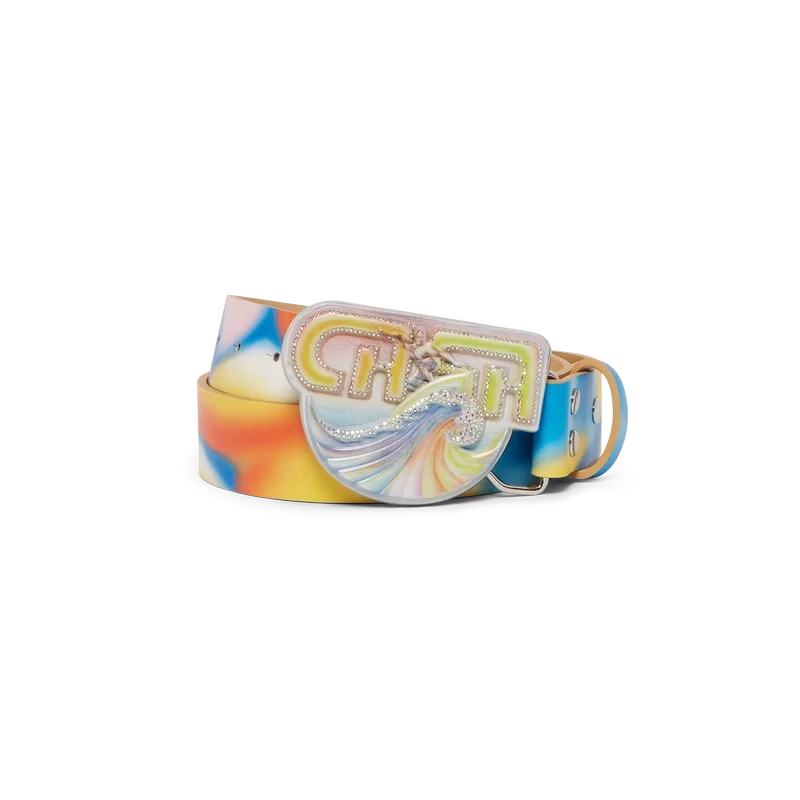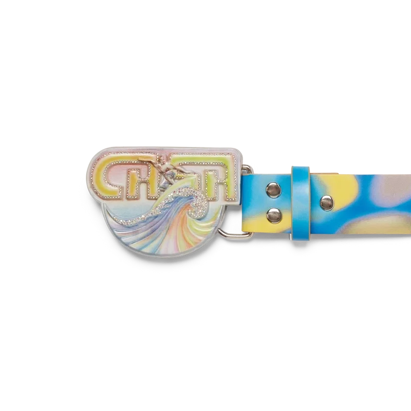 Der Surf Trip Gürtel ist ein mehrfarbiges Design mit saisonalen Motiven, inspiriert von der Vintage-Surfkultur in Malibu, gefertigt aus Kalbsleder. Abgerundet durch eine bemalte Messingschnalle mit Schriftzügen aus dieser Ära.