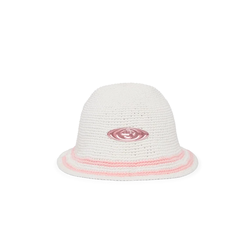 Die Bourgeoisie Girl Häkelmütze hat eine klassische Bucket-Silhouette und verfügt über einen gewebten Casablanca-Logo-Aufnäher, der dem von Sportbekleidung inspirierten Design eine zusätzliche strukturelle Dimension verleiht. Abgerundet durch eine rosa-weiß gestreifte Krempe.