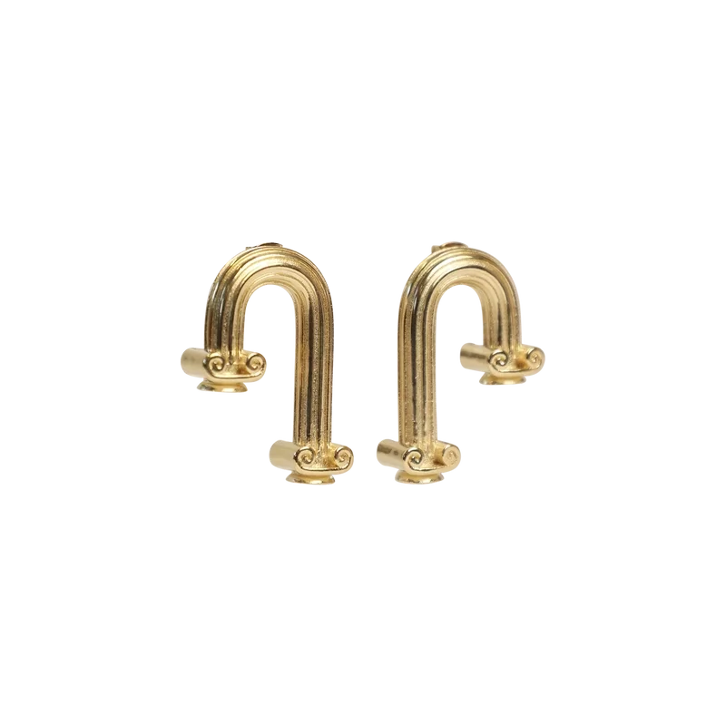 Die Arch Column Ohrringe greifen das antike griechische Thema der Saison auf. Sie sind aus verzerrten griechischen Säulen aus vergoldetem Messing gefertigt. Für Ohrlöcher konzipiert.