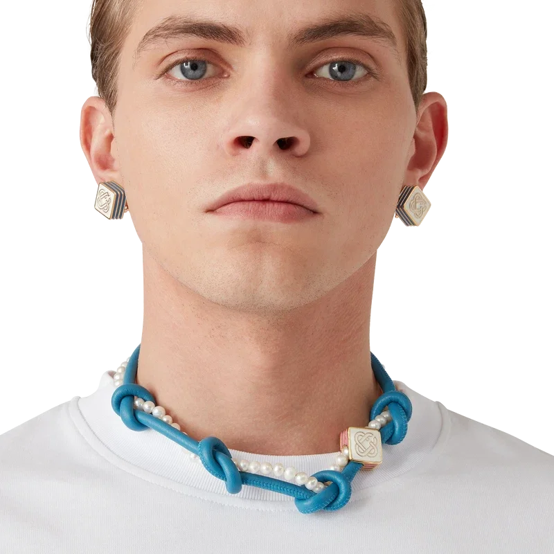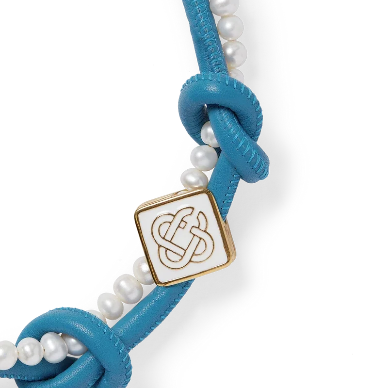 Die blaue geknotete Halskette ist aus Leder und Süßwasserperlen gefertigt und ziert das charakteristische Diamant-Logo des Hauses. Abgerundet durch einen vergoldeten Karabinerverschluss und eine Kette.<!–