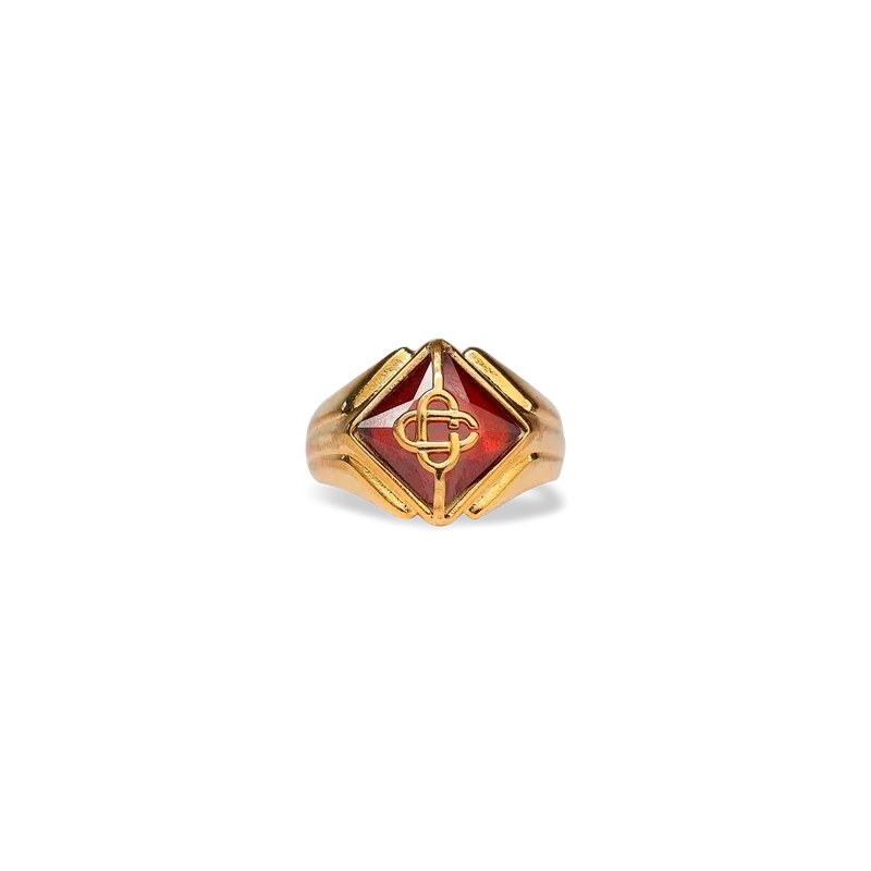 Der Casa-Siegelring ist aus vergoldetem Messing und Kristallen gefertigt. Er ist mit dem ineinander verschlungenen Cc-Diamant-Logo des Hauses und bemalten Details auf dem Ringband verziert – dieses Stück wird mit einer Geschenkbox, einem Staubbeutel und einer Produktbroschüre geliefert.